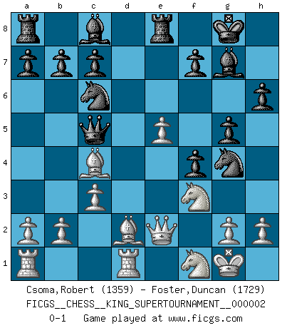 Last move : 0-1 2018 May 17 22:26:47 [Event "FICGS__CHESS__KING_SUPERTOURNAMENT__000002"] [Site "FICGS"] [Date "2018.05.01"] [Round "1"] [White "Csoma,Robert"] [Black "Foster,Duncan"] [Result "0-1"] [WhiteElo "1359"] [BlackElo "1729"] 1.e4 e5 2.f4 exf4 3.Nf3 g5 4.Bc4 Nc6 5.O-O d6 6.d4 Bg7 7.c3 h6 8.Qe2 Nf6 9.Nbd2 O-O 10.e5 Re8 11.Rd1 Ng4 12.Nf1 dxe5 13.dxe5 Qe7 14.Bd2 Qc5+ 0-1 KGA : Blachly gambit Kingside Castling by player White (move 5) Kingside Castling by player Black (move 9) Player Black won this chess game. Follow this game move after move (download)Is Bobby Fischer quite sane ? (Salo Flohr) Irgendwie scheint mir sonntags früh um 9 Uhr der Killerinstinkt verloren gegangen zu sein. (Alexej Shirov) La esencia del Ajedrez es pensar acerca de lo que el Ajedrez es. (David Bronstein) Un millionnaire : 'Monsieur Steinitz ! Vous ne participez aux tournois que pour l'argent, alors que moi je n'y viens que pour l'honneur.' Steinitz : 'Chacun joue pour ce qu'il n'a pas'... It is a good thing for an uneducated man to read books of quotations. (Winston Churchill)