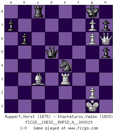 Last move : 1-0 2007 July 24 23:44:20 [Event "FICGS__CHESS__RAPID_A__000019"] [Site "FICGS"] [Date "2007.05.03"] [Round "1"] [White "Ruppert,Horst"] [Black "Khachaturov,Vadim"] [Result "1-0"] [WhiteElo "1875"] [BlackElo "1803"] 1.d4 Nf6 2.c4 g6 3.Nc3 d5 4.cxd5 Nxd5 5.e4 Nxc3 6.bxc3 Bg7 7.Bc4 c5 8.Ne2 Nc6 9.Be3 O-O 10.O-O Bg4 11.f3 Na5 12.Bxf7+ Rxf7 13.fxg4 Rxf1+ 14.Kxf1 Qd6 15.e5 Qd5 16.Bf2 Rd8 17.Qc2 Qc4 18.Qb2 Rf8 19.Kg1 Qd3 20.Ng3 Bh6 21.Qb1 Qxc3 22.Ne4 Qc4 23.g5 Bg7 24.Qe1 b6 25.Nf6+ exf6 26.exf6 cxd4 27.fxg7 Rd8 28.Rc1 Qd5 29.Qe7 Nb7 30.Qf6 Nc5 31.Re1 d3 32.Re5 Qd7 33.Re7 Qd5 34.Be3 Nd7 35.Qf4 Nc5 36.h3 Qxa2 37.h4 Qd5 38.h5 d2 39.Bxd2 gxh5 40.Bc3 Nd3 41.Qf6 Rc8 42.Re3 Nc5 43.Qh6 Ne4 44.g6 1-0 King's Indian defense, 3.Nc3 Kingside Castling by player Black (move 9) Kingside Castling by player White (move 10) Player White won this chess game. Follow this game move after move (download)All Chess players should have a hobby. (Savielly Tartakower) Wenn sie aufgeben, dann danke ich Ihnen für das Spiel (Eventualzug beim Fernschach). (Anonymous) Debemos de asegurarnos de que el Ajedrez no se convierta en un lenguaje muerto, muy interesante, pero tan solo para un grupo muy pequeño. (Sytze Faber) On peut tirer plus d'utilité d'une partie perdue que de 100 parties gagnées. (Capablanca) Computers make it easier to do a lot of things, but most of the things they make it easier to do don't need to be done. (Andy Rooney)