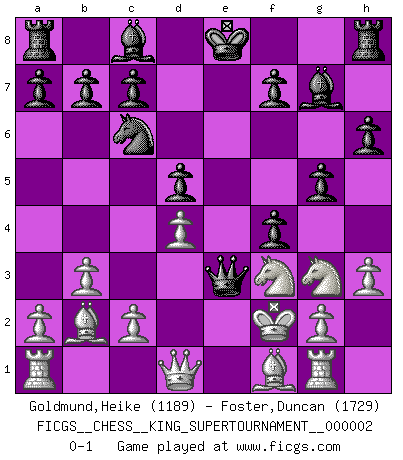 Last move : 0-1 2018 May 15 17:43:7 [Event "FICGS__CHESS__KING_SUPERTOURNAMENT__000002"] [Site "FICGS"] [Date "2018.05.01"] [Round "1"] [White "Goldmund,Heike"] [Black "Foster,Duncan"] [Result "0-1"] [WhiteElo "1189"] [BlackElo "1729"] 1.e4 e5 2.f4 exf4 3.Nf3 g5 4.h3 h6 5.b3 Nf6 6.Bb2 Bg7 7.Nc3 Nxe4 8.d4 Ng3 9.Rg1 Qe7+ 10.Ne2 Nc6 11.Kf2 d5 12.Nxg3 Qe3+ 0-1 King's knight's gambit Player Black won this chess game. Follow this game move after move (download)Bobby just drops the pieces and they fall on the right squares. (Miguel Najdorf) Ich bewundere Kasparows phantasievolle Angriffssiege aus den Achtzigern und Neunzigern, aber wenn man sie mit dem Computer überprüft, nimmt der Computer in jeder zweiten Partie die Opfer an, verteidigt sich und gewinnt. (Vladimir Kramnik) Bobby Fischer es el mas grande genio de Ajedrez de todos los tiempos. (Alexander Kotov) Soyez une menace à chaque fois que vous vous asseyez pour jouer. (Ken Smith) The difference between stupidity and genius is that genius has its limits. (Murphy)
