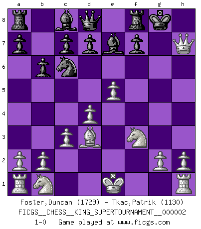 Last move : 1-0 2018 May 16 19:18:53 [Event "FICGS__CHESS__KING_SUPERTOURNAMENT__000002"] [Site "FICGS"] [Date "2018.05.01"] [Round "1"] [White "Foster,Duncan"] [Black "Tkac,Patrik"] [Result "1-0"] [WhiteElo "1729"] [BlackElo "1130"] 1.e4 e5 2.f4 exf4 3.Nf3 Bc5 4.d4 Bb4+ 5.c3 Bd6 6.e5 Be7 7.Bxf4 Nh6 8.Bd3 O-O 9.Qc1 Nc6 10.Bxh6 gxh6 11.Qxh6 b6 12.Qxh7+ 1-0 King's knight's gambit Kingside Castling by player Black (move 8) Player White won this chess game. Follow this game move after move (download)Is Bobby Fischer quite sane ? (Salo Flohr) Man gibt nur Pakete auf. (Paul Keres) Aquellos que dicen que entienden al Ajedrez, no entienden nada. (Robert Hubner) Si je n'étais pas joueur d'échecs, je serais le meilleur dans quelque chose d'autre. (Anatoli Karpov) You can think I'm wrong, but that's no reason to quit thinking. (Gregory House, House M.D.)