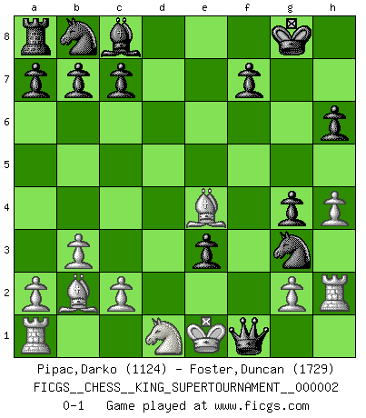 Last move : 0-1 2018 June 26 15:13:1 [Event "FICGS__CHESS__KING_SUPERTOURNAMENT__000002"] [Site "FICGS"] [Date "2018.05.01"] [Round "1"] [White "Pipac,Darko"] [Black "Foster,Duncan"] [Result "0-1"] [WhiteElo "1124"] [BlackElo "1729"] 1.e4 e5 2.f4 exf4 3.Nf3 g5 4.h3 h6 5.b3 Nf6 6.Bb2 Bg7 7.d3 O-O 8.h4 g4 9.Ne5 d6 10.Nc4 Re8 11.Nc3 d5 12.Nd2 Nh5 13.Be2 Ng3 14.Rh2 dxe4 15.dxe4 Qd4 16.Nf1 Qg1 17.Bd3 Bd4 18.Qd2 Be3 19.Qxe3 fxe3 20.Nd1 Rxe4 21.Bxe4 Qxf1+ 0-1 King's knight's gambit Kingside Castling by player Black (move 7) Player Black won this chess game. Follow this game move after move (download)Chess is a part of culture and if a culture is declining then Chess too will decline. (Mikhail Botvinnik) Ihnen, Herr Lasker, habe ich nur drei Worte zu sagen: Schach und matt. (Siegbert Tarrasch) El sobresalir en el Ajedrez es un signo de una mente intrigante. (Sir Arthur Conan Doyle) Les échecs sont utiles à l'exercice de la faculté de penser et à celle de l'imagination. Car nous devons posséder une méthode élaborée pour atteindre des buts partout où nous devons conduire notre raison. (Leibnitz) It is not true that people stop pursuing dreams because they grow old, they grow old because they stop pursuing dreams. (Gabriel Garcia Marquez)