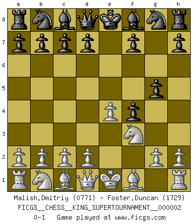 Last move : 0-1 2018 June 3 0:45:49 [Event "FICGS__CHESS__KING_SUPERTOURNAMENT__000002"] [Site "FICGS"] [Date "2018.05.01"] [Round "1"] [White "Malish,Dmitriy"] [Black "Foster,Duncan"] [Result "0-1"] [WhiteElo "0771"] [BlackElo "1729"] 1.e4 e5 2.f4 exf4 3.Nf3 g5 0-1 This chess game has been lost on time (started : 2018.05.01 22:10:15) King's knight's gambit Player Black won this chess game. Follow this game move after move (download)The King is a fighting piece. Use it ! (Wilhelm Steinitz) Es hat in meinem Leben Zeiten gegeben, in denen das Schachspiel, wenn nicht zum Lebenszweck, so doch zu einem regelrechten Lebensersatz geworden ist. Man fühlt sich in solchen Zeiten nicht so, als besäße man eine göttliche Gabe, sondern eher so, als sei man von ihr besessen. (Garry Kasparov) Las piezas de Ajedrez son los bloques del alfabeto que moldean los pensamientos; y esos pensamientos, aunque hagan un diseño visual en el tablero, expresan abstractamente su belleza como un poema. (Marcel Duchamp) La tactique est l'élément le plus important du milieu de jeu. (Siegbert Tarrasch) Only sick music makes money today. (Friedrich Nietzsche)