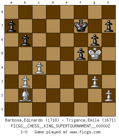 Last move : 1-0 2018 August 7 15:16:49 [Event "FICGS__CHESS__KING_SUPERTOURNAMENT__000002"] [Site "FICGS"] [Date "2018.05.01"] [Round "1"] [White "Barbosa,Edinardo"] [Black "Trigance,Emile"] [Result "1-0"] [WhiteElo "1718"] [BlackElo "1671"] 1.e4 e5 2.f4 d5 3.exd5 e4 4.d3 Nf6 5.dxe4 Nxe4 6.Nf3 Bc5 7.Qe2 Bf5 8.Nc3 Qe7 9.Be3 Nxc3 10.Bxc5 Nxe2 11.Bxe7 Nxf4 12.Ba3 Nd7 13.O-O-O O-O-O 14.Rd4 Nxd5 15.Rxd5 Be4 16.Rd4 Nf6 17.Rxd8+ Rxd8 18.Bc4 Nd5 19.Re1 f5 20.Bxd5 Rxd5 21.Rd1 Ra5 22.Be7 Rd5 23.Rxd5 Bxd5 24.Kd2 Kd7 25.Bc5 b6 26.Bd4 g6 27.b3 c5 28.Bb2 Ke7 29.Ne1 Kd6 30.Ke3 Be4 31.g3 Ke6 32.Nd3 Bxd3 33.Kxd3 Kd5 34.Ke3 c4 35.Kf4 cxb3 36.axb3 Ke6 37.Kg5 Kf7 38.c4 1-0 KGD : Falkbeer, Main line, 7...Bf5 Queenside Castling by player White (move 13) Queenside Castling by player Black (move 13) Player White won this chess game. Follow this game move after move (download)We must make sure that Chess will not be like a dead language, very interesting, but for a very small group. (Sytze Faber) Bis zum Jahr 1971 verlief in meiner Schachkariere alles glatt. Dieses dramatische Match [Fischer-Taimanov 6:0] machte mein Leben zur Hölle. (Mark Taimanov) Observen a Garry Kasparov. Después de una derrota, invariablemente el gana la próxima partida. Prácticamente hace pedazos a su siguiente oponente. Eso es algo que tenemos que aprender a lograr. (Maurice Ashley) Votre seul travail dans les ouvertures est d'obtenir un milieu de partie jouable. (Lajos Portish) When it is a question of money, everybody is of the same religion. (Voltaire)