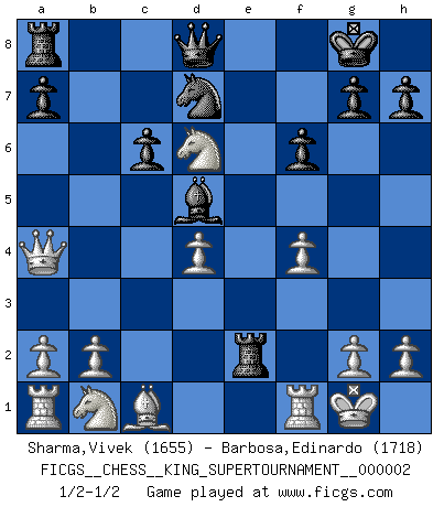 Last move : 1/2-1/2 2018 May 20 17:56:14 [Event "FICGS__CHESS__KING_SUPERTOURNAMENT__000002"] [Site "FICGS"] [Date "2018.05.01"] [Round "1"] [White "Sharma,Vivek"] [Black "Barbosa,Edinardo"] [Result "1/2-1/2"] [WhiteElo "1655"] [BlackElo "1718"] 1.e4 e5 2.f4 d5 3.Nf3 dxe4 4.Nxe5 Nf6 5.d4 exd3 6.cxd3 Bd6 7.Qb3 O-O 8.d4 Be6 9.Qxb7 Bd5 10.Qb5 c6 11.Qa4 Ne4 12.Bd3 Re8 13.O-O f6 14.Nc4 Nd7 15.Bxe4 Rxe4 16.Nxd6 Re2 17.Rf2 Re1+ 18.Rf1 Re2 19.Rf2 Re1+ 20.Rf1 Re2 1/2-1/2 KGD : Falkbeer, Tartakower variation Kingside Castling by player Black (move 7) Kingside Castling by player White (move 13) This chess game ended in a draw. Follow this game move after move (download)Whoever sees no other aim in the game than that of giving checkmate to one's opponent will never become a good Chess player. (Euwe) Korrekt heißt in Deutschland die Haltung eines Mannes, dessen Benehmen nach dem Urteile seiner Nachbarn seiner Stellung angemessen ist. Um korrekt zu sein, muß man sich der Meinung der anderen anpassen... (Emanuel Lasker) Los asuntos humanos son como una partida de Ajedrez: solo aquellos que no lo toman seriamente, pueden ser llamados buenos jugadores. (Hung Tzu Ch'eng) La solitude du joueur d'Echecs à l'approche du mat est semblable à celle du condamné. (Francis Szpiner) In fact if nothing is done against this teddy bear, hereby I announce that I would quit chess, rapid chess, blitz chess, postal chess, email chess, server chess and correspondence chess I will then switch to a table game where teddy bears aren't going to be seen for a while, like Poker, or Roulette, all 18+ games. (Elmer Valderrama)