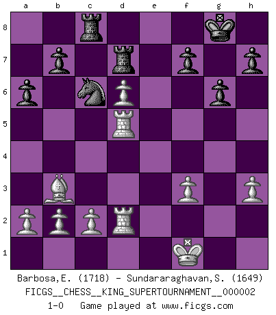 Last move : 1-0 2018 August 1 8:51:39 [Event "FICGS__CHESS__KING_SUPERTOURNAMENT__000002"] [Site "FICGS"] [Date "2018.05.01"] [Round "1"] [White "Barbosa,Edinardo"] [Black "Sundararaghavan,Shailesh"] [Result "1-0"] [WhiteElo "1718"] [BlackElo "1649"] 1.e4 e5 2.f4 exf4 3.Bc4 Qh4+ 4.Kf1 Bc5 5.d4 Be7 6.Nf3 Qh5 7.Bxf4 d6 8.Nc3 Be6 9.d5 Bg4 10.h3 Bxf3 11.Qxf3 Qxf3+ 12.gxf3 Nf6 13.e5 dxe5 14.Bxe5 Nbd7 15.Bxc7 O-O 16.d6 Bd8 17.Bxd8 Rfxd8 18.Rd1 a6 19.Rh2 Ne5 20.Be2 Rd7 21.Nd5 Nxd5 22.Rxd5 Nc6 23.Bc4 g6 24.Rhd2 Rc8 25.Bb3 1-0 This chess game has been lost on time (started : 2018.05.01 22:10:15) KGA : Bishop's gambit, Greco variation Kingside Castling by player Black (move 15) Player White won this chess game. Follow this game move after move (download)Chess is a terrible game. If you have no center, your opponent has a freer position. If you do have a center, then you really have something to worry about ! (Siegbert Tarrasch) Die meiste Zeit treffe ich auf Gegner, die meine Enkel sein könnten. Ich bin da, um ihnen zu zeigen, dass sie von mir noch einiges lernen können. (Viktor Kortschnoi) Nos gusta pensar. (Gary Kasparov) Les échecs c'est le défi de l'alpiniste, toujours plus haut, prêt à tout pour monter à l'assaut du Roi ennemi. Les échecs, c'est de la musique en mouvement, un ballet majestueux pour les yeux. C'est de la poésie composée par les fantômes du passé qui au même titre que Rimbaud ou Verlaine méritent notre admiration. Les échecs, c'est de la peinture ou le moindre mouvement modifie le tableau pour en faire un Picasso ou un Van Gogh. Les échecs, c'est tout et rien, c'est la vie et la mort. Jjulie33 sur le forum de France-Echecs. The bottom line is always the bottom line. (Johann Piek)