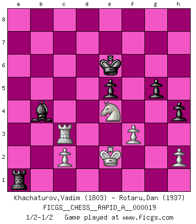 Last move : 1/2-1/2 2007 July 20 21:18:50 [Event "FICGS__CHESS__RAPID_A__000019"] [Site "FICGS"] [Date "2007.05.03"] [Round "1"] [White "Khachaturov,Vadim"] [Black "Rotaru,Dan"] [Result "1/2-1/2"] [WhiteElo "1803"] [BlackElo "1937"] 1.e4 c5 2.Nf3 d6 3.d4 cxd4 4.Nxd4 Nf6 5.Nc3 a6 6.Be3 e5 7.Nb3 Be6 8.f3 Be7 9.Qd2 O-O 10.O-O-O Nbd7 11.g4 b5 12.g5 b4 13.gxf6 bxc3 14.Qxc3 Nxf6 15.Rg1 Qc8 16.Qxc8 Rfxc8 17.Bg5 a5 18.Bxf6 Bxf6 19.Rxd6 a4 20.Nd2 Be7 21.Ra6 Bc5 22.Rg5 Bd4 23.Rxa8 Rxa8 24.Kb1 Rb8 25.b3 Rd8 26.Bd3 axb3 27.Nxb3 Bc3 28.Kc1 g6 29.Rg2 Ra8 30.Kb1 Rb8 31.Kc1 Kg7 32.a4 Bd7 33.a5 Be6 34.a6 Ra8 35.Nc5 Bc8 36.Kd1 h5 37.Bb5 Rb8 38.Bc6 Rb1+ 39.Ke2 Ra1 40.Bb5 Bh3 41.Rf2 Ra5 42.Nb3 Ra2 43.Ke3 Ra3 44.Ke2 g5 45.Bd3 Kf6 46.Bc4 Bb4 47.Bb5 Kg6 48.Bd3 f5 49.exf5+ Bxf5 50.Rg2 Be7 51.Bxf5+ Kxf5 52.Nd2 Rxa6 53.Ne4 Kf4 54.Ng3 h4 55.Nf1 Kf5 56.Ne3+ Ke6 57.Rg4 Ra5 58.Rc4 Bc5 59.Ng4 Kd5 60.Rc3 Ra1 61.Nf6+ Ke6 62.Ne4 Bb4 1/2-1/2 Sicilian : Najdorf, Byrne (English) attack Kingside Castling by player Black (move 9) Queenside Castling by player White (move 10) This chess game ended in a draw. Follow this game move after move (download)I like to say that Bobby Fischer was the greatest player ever. But what made Fischer a genius was his ability to blend an American freshness and pragmatism with Russian ideas about strategy. (Bruce Pandolfini) Habe Mut, dich deines eigenen Verstandes zu bedienen. (Immanuel Kant) Antes de los Finales, los dioses han colocado el Juego Medio. (Siegbert Tarrasch) Que feriez-vous si vous étiez en train de jouer aux échecs et que la fin du monde arrive ? Je continuerais à jouer. (Saint Borromée) Begin at the beginning and go on till you come to the end; then stop. (Lewis Carrol, Alice in Wonderland)