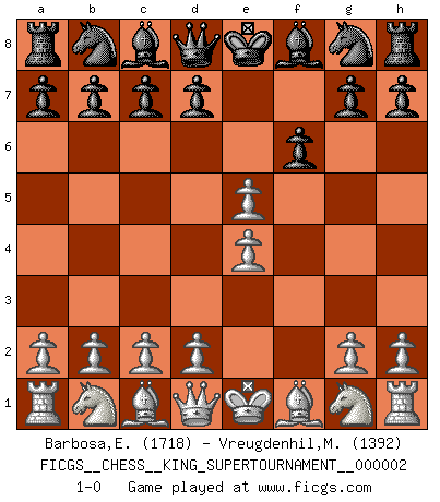 Last move : 1-0 2018 June 4 1:2:54 [Event "FICGS__CHESS__KING_SUPERTOURNAMENT__000002"] [Site "FICGS"] [Date "2018.05.01"] [Round "1"] [White "Barbosa,Edinardo"] [Black "Vreugdenhil,Maarten"] [Result "1-0"] [WhiteElo "1718"] [BlackElo "1392"] 1.e4 e5 2.f4 f6 3.fxe5 1-0 This chess game has been lost on time (started : 2018.05.01 22:10:15) King's gambit Player White won this chess game. Follow this game move after move (download)There are two types of sacrifices: correct ones and mine. (Mikhail Tal) Im Reiche der Wirklichkeit ist man nie so glücklich wie im Reiche der Gedanken. (Arthur Schopenhauer) Siempre es mejor sacrificar los hombres de tu oponente. (Savielly Tartakower) La vérité est comme le meilleur coup aux échecs : elle existe, mais il faut la chercher. (Arturo Perez-Reverte) When you stop learning you start dying. (Scott Adams)