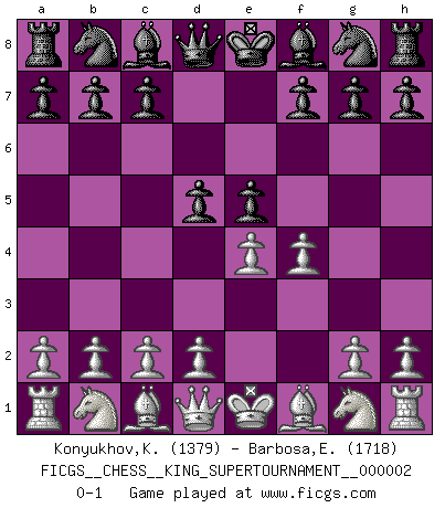 Last move : 0-1 2018 June 3 0:45:49 [Event "FICGS__CHESS__KING_SUPERTOURNAMENT__000002"] [Site "FICGS"] [Date "2018.05.01"] [Round "1"] [White "Konyukhov,Konstantin"] [Black "Barbosa,Edinardo"] [Result "0-1"] [WhiteElo "1379"] [BlackElo "1718"] 1.e4 e5 2.f4 d5 0-1 This chess game has been lost on time (started : 2018.05.01 22:10:15) KGD : Falkbeer counter-gambit Player Black won this chess game. Follow this game move after move (download)There are tough players and nice guys, and I'm a tough player. (Bobby Fischer) Gott hat gewollt, dass ich Champion werde. (Surab Azmajparaschvili) Una buena ofensiva y una buena defensa, comienzan ambas con un buen desarrollo. (Bruce A. Moon) La menace est plus forte que l'exécution. (Aaron Nimzovitch) Creativity involves breaking out of established patterns in order to look at things in a different way. (Edward De Bono)