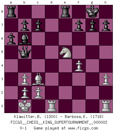 Last move : 0-1 2018 May 28 9:38:56 [Event "FICGS__CHESS__KING_SUPERTOURNAMENT__000002"] [Site "FICGS"] [Date "2018.05.01"] [Round "1"] [White "Klawitter,Bernd"] [Black "Barbosa,Edinardo"] [Result "0-1"] [WhiteElo "1300"] [BlackElo "1718"] 1.e4 e5 2.f4 d5 3.exd5 e4 4.Bc4 Nf6 5.Nc3 Bc5 6.d4 exd3 7.Qxd3 O-O 8.Nge2 Re8 9.Bd2 Bg4 10.O-O-O Nbd7 11.Kb1 Bf2 12.h3 Nc5 13.Qf3 Bxf3 14.gxf3 a6 15.Bb3 Nxb3 16.axb3 Nxd5 17.Nxd5 Qxd5 18.Bc3 Qxf3 19.Nc1 Qc6 20.Nd3 Bb6 21.Ne5 Qb5 0-1 KGD : Falkbeer, 3...e4 Kingside Castling by player Black (move 7) Queenside Castling by player White (move 10) Player Black won this chess game. Follow this game move after move (download)You sit at the board and suddenly your heart leaps. Your hand trembles to pick up the piece and move it. But what Chess teaches you is that you must sit there calmly and think about whether it's really a good idea and whether there are other better ideas. (Stanley Kubrick) Nur ein wirklich starker Spieler weiß wie schwach er spielt. (Savielly Grigorievitsch Tartakower) Cuando estes solo, cuando te sientas un extraño en el mundo, juega al Ajedrez. Esto levantará tu espiritu y será tu consejero de guerra. (Aristóteles) Les Echecs mettent en conflit, non pas deux intelligences, mais deux volontés. (Lasker) The existence of forgetting has never been proved: We only know that some things don't come to mind when we want them. (Friedrich Nietzsche)