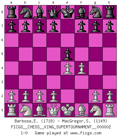 Last move : 1-0 2018 June 1 0:38:7 [Event "FICGS__CHESS__KING_SUPERTOURNAMENT__000002"] [Site "FICGS"] [Date "2018.05.01"] [Round "1"] [White "Barbosa,Edinardo"] [Black "MacGregor,Steven"] [Result "1-0"] [WhiteElo "1718"] [BlackElo "1149"] 1.e4 e5 2.f4 1-0 This chess game has been lost on time (started : 2018.05.01 22:10:15) King's gambit Player White won this chess game. Follow this game move after move (download)It is not a move, even the best move that you must seek, but a realizable plan. (Eugene Znosko-Borovsky) Obendrein hat der FIDE-Präsident den Revolutionsführer Gaddafi zum »Großmeister« ernannt, am Ende der WM. Das ist lächerlich! (Joel Lautier) La partida mas dura de ganar es una partida ganada. (Emanuel Lasker) Les réformistes prétendent que les progrès de la théorie conduiront à la disparition des échecs, et qu'il faut, pour leur rendre vie, en remanier les règles. En réalité, qu'exprime cette affirmation? Le mépris de l'intuition, de l'imagination et de tous les autres éléments qui font des échecs un art. (Alexander Alekhine) No, no, you're not thinking; you're just being logical. (Niels Bohr)