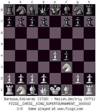Last move : 1-0 2018 June 3 0:45:49 [Event "FICGS__CHESS__KING_SUPERTOURNAMENT__000002"] [Site "FICGS"] [Date "2018.05.01"] [Round "1"] [White "Barbosa,Edinardo"] [Black "Malish,Dmitriy"] [Result "1-0"] [WhiteElo "1718"] [BlackElo "0771"] 1.e4 e5 2.f4 exf4 3.Nf3 1-0 This chess game has been lost on time (started : 2018.05.01 22:10:15) King's knight's gambit Player White won this chess game. Follow this game move after move (download)Many have become Chess Masters, no one has become the Master of Chess. (Siegbert Tarrasch) Stelle das Brett so, daß die Sonne in die Augen deines Gegners scheint. (Ruy López) En la perfecta combinación de Ajedrez como en una historia corta de primera clase, toda la trama y contra trama deberá conducir hacia un final sorprendente, el interes no es mitigado hasta el último momento. (Yates and Winter) Le temps de noter son nom sur la feuille de partie, j'étais déjà en zeitnot ! D'un modeste amateur apparié lors de la première ronde d'un open contre le grand-maître Azmaïparashvili. A computer lets you make more mistakes faster than any invention in human history - with the possible exceptions of handguns and tequila. (Mitch Ratcliffe)
