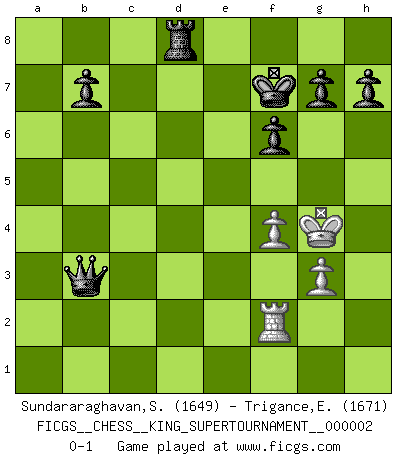 Last move : 0-1 2018 July 9 9:7:14 [Event "FICGS__CHESS__KING_SUPERTOURNAMENT__000002"] [Site "FICGS"] [Date "2018.05.01"] [Round "1"] [White "Sundararaghavan,Shailesh"] [Black "Trigance,Emile"] [Result "0-1"] [WhiteElo "1649"] [BlackElo "1671"] 1.e4 e5 2.f4 d5 3.exd5 e4 4.Bb5+ c6 5.dxc6 Nxc6 6.g3 Nf6 7.d3 Qd5 8.Bxc6+ Qxc6 9.Kf1 exd3 10.Qf3 Qxc2 11.Nd2 Bc5 12.Ne4 Be7 13.Nxf6+ Bxf6 14.Qe4+ Kf8 15.Qb4+ Kg8 16.Qb3 Qc6 17.Qxd3 Qxh1 18.Be3 Bh3+ 19.Ke2 Qxh2+ 20.Bf2 Re8+ 21.Kd1 Rd8 22.Qxd8+ Bxd8 23.Nxh3 Qxh3 24.Ke2 Qe6+ 25.Kf1 f6 26.Re1 Qc4+ 27.Kg2 Kf7 28.Bxa7 Qxa2 29.Bf2 Qxb2 30.Kf3 Bb6 31.Re2 Qb3+ 32.Kg4 Bxf2 33.Rxf2 Rd8 0-1 KGD : Falkbeer, Nimzovich variation Player Black won this chess game. Follow this game move after move (download)Fischer is completely natural. He plays no roles. He's like a child. Very, very simple. (Zita Rajcsanyi) Die Leute spielen gegen mich seit 15 Jahren unter Ihren Möglichkeiten. (Robert James Fischer) Fischer es el jugador mas fuerte del mundo. De hecho, el jugador mas fuerte que jamas haya existido. (Larry Evans) J'ai toujours senti une vague pitié pour l'homme qui ne connaît rien aux échecs, tout comme j'en aurais pour un homme ignorant de l'amour. Les Echecs, comme la musique ou comme l'amour, ont le pouvoir de rendre heureux. (Siegbert Tarrasch) Chess, like love, like music, has the power to make people happy. (Siegbert Tarrasch)