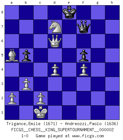 Last move : 1-0 2018 July 30 15:18:14 [Event "FICGS__CHESS__KING_SUPERTOURNAMENT__000002"] [Site "FICGS"] [Date "2018.05.01"] [Round "1"] [White "Trigance,Emile"] [Black "Andreozzi,Paolo"] [Result "1-0"] [WhiteElo "1671"] [BlackElo "1636"] 1.e4 e5 2.f4 d5 3.exd5 exf4 4.Bb5+ Bd7 5.Qe2+ Qe7 6.Nc3 a6 7.Bxd7+ Nxd7 8.d4 g5 9.Bd2 O-O-O 10.O-O-O Ngf6 11.Qd3 Ng4 12.Nh3 h6 13.Rde1 Qd6 14.Qf5 Ngf6 15.Nf2 Kb8 16.Nfe4 Nxe4 17.Nxe4 Qg6 18.Qh3 f5 19.Nc3 g4 20.Qd3 Bd6 21.Re6 Qf7 22.Rf1 f3 23.gxf3 g3 24.hxg3 Bxg3 25.Rxh6 Rxh6 26.Bxh6 Qh5 27.Bd2 Re8 28.f4 Nf8 29.Qxg3 Nd7 30.Re1 Rxe1+ 31.Qxe1 Nb6 32.b3 Kc8 33.Qe6+ Kd8 34.d6 cxd6 35.Qxd6+ Nd7 36.Nd5 Qf7 37.Ba5+ Ke8 38.Nc7+ Kd8 39.Nxa6 Ke8 40.Nb8 b5 41.Nxd7 1-0 KGD : Falkbeer counter-gambit Queenside Castling by player Black (move 9) Queenside Castling by player White (move 10) Player White won this chess game. Follow this game move after move (download)I am the best player in the world and I am here to prove it. (Bobby Fischer) Deine Wertungszahl - vorausgesetzt einige Jahre schachliche Anstrengung - entspricht etwa dem zehnfachen Deines IQ plus 1000. (Jonathan Levitt) Ayuda a tus piezas para que ellas te puedan ayudar. (Paul Morphy) Le pion, dans sa simplicité, marche droit devant lui, mais lorsqu'il prend, il le fait obliquement? Ainsi l'homme, tant qu'il reste pauvre, marche dans la droiture et vit honnêtement, mais lorsqu'il recherche les honneurs, il flatte, se parjure et, par les voies obliques, cherche une position supérieure sur l'échiquier du monde. (Jean de Galles) The problem with manipulation is that people can turn on you. (Horatio Caine, C.S.I. Miami)