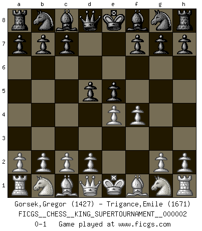 Last move : 0-1 2018 June 1 12:40:23 [Event "FICGS__CHESS__KING_SUPERTOURNAMENT__000002"] [Site "FICGS"] [Date "2018.05.01"] [Round "1"] [White "Gorsek,Gregor"] [Black "Trigance,Emile"] [Result "0-1"] [WhiteElo "1427"] [BlackElo "1671"] 1.e4 e5 2.f4 d5 0-1 This chess game has been lost on time (started : 2018.05.01 22:10:15) KGD : Falkbeer counter-gambit Player Black won this chess game. Follow this game move after move (download)The hallmark of the artist is simplicity. (Larry Evans) Dieses schreckliche Gefühl, dass ich gegen eine Maschine spielte, die niemals Fehler macht, zerschmetterte meinen Widerstand. (Mark Taimanov) Evita las multitudes. Haz independientemente tu propio razonamiento. Trata de ser el jugador de Ajedrez, no la pieza de Ajedrez. (Ralph Charell) Je menace de comprendre la position. (Anonyme) Life is the sum of all your choices. (Albert Camus)