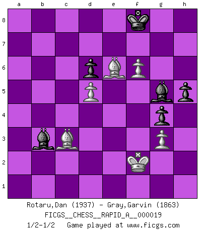 Last move : 1/2-1/2 2007 July 21 0:18:9 [Event "FICGS__CHESS__RAPID_A__000019"] [Site "FICGS"] [Date "2007.05.03"] [Round "1"] [White "Rotaru,Dan"] [Black "Gray,Garvin"] [Result "1/2-1/2"] [WhiteElo "1937"] [BlackElo "1863"] 1.d4 Nf6 2.Nf3 g6 3.c4 Bg7 4.g3 d5 5.cxd5 Nxd5 6.Bg2 O-O 7.O-O Nc6 8.e4 Nb6 9.d5 Ne5 10.Nxe5 Bxe5 11.Nc3 c6 12.a4 cxd5 13.exd5 Bg7 14.Re1 Re8 15.a5 Nc4 16.Qb3 Nd6 17.Bf4 Bf5 18.Nb5 Qd7 19.Nxd6 exd6 20.Qb4 Bf8 21.h3 Rxe1+ 22.Rxe1 Rc8 23.Rc1 Rxc1+ 24.Bxc1 a6 25.h4 Bg7 26.Bf4 Bf8 27.Bf3 h5 28.Qb6 Bd3 29.Bg2 Bf5 30.Kh2 Be7 31.Bd2 Bf8 32.Bc3 Bg7 33.Bb4 Bf8 34.Qa7 Qc7 35.Qa8 Bc8 36.Bd2 Bg7 37.Bf4 Bf8 38.b4 Bf5 39.Bg5 Qc8 40.Qxc8 Bxc8 41.Bf1 Bf5 42.f3 Bc2 43.Bc4 Kg7 44.Kg2 f6 45.Bd2 Be7 46.Kf2 g5 47.b5 axb5 48.Bxb5 Bd8 49.hxg5 fxg5 50.Bc3+ Kf8 51.Bd7 Bb3 52.Be6 Bc4 53.Kg2 b6 54.axb6 Bxb6 55.f4 g4 56.f5 Be3 57.f6 Bg5 58.Kf2 Bb3 1/2-1/2 King's Indian : East Indian defense Kingside Castling by player Black (move 6) Kingside Castling by player White (move 7) This chess game ended in a draw. Follow this game move after move (download)A chess genius has died; a loss for humanity. (Viktor Kortchnoi, about Bobby Fischer's death) Meine Liebe ist Schach, Schach, Schach. Ich muss jeden Tag Schach spielen, deshalb fühle ich mich so stark. (Miguel Najdorf) El Ajedrez es 99 por ciento táctica. (Teichmann) Karpov est une pièce de musée. (Garry Kasparov) The human is the only animal species whose members are able to talk themselves into difficulties that would not otherwise exist. (Wendell Johnson)