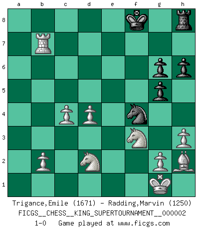 Last move : 1-0 2018 August 23 23:2:59 [Event "FICGS__CHESS__KING_SUPERTOURNAMENT__000002"] [Site "FICGS"] [Date "2018.05.01"] [Round "1"] [White "Trigance,Emile"] [Black "Radding,Marvin"] [Result "1-0"] [WhiteElo "1671"] [BlackElo "1250"] 1.e4 e5 2.f4 exf4 3.Nf3 d6 4.d4 Nc6 5.Bc4 Nf6 6.Qe2 Bg4 7.c3 Qd7 8.Bxf4 O-O-O 9.O-O h6 10.h3 Bh5 11.Nbd2 Re8 12.Bb5 g5 13.Bh2 a6 14.Ba4 b5 15.Bc2 Bg7 16.a4 Ne7 17.axb5 Qxb5 18.Qxb5 axb5 19.Ra5 Kd7 20.Rxb5 Rc8 21.e5 Kc6 22.Ra5 Nfd5 23.Be4 Bg6 24.exd6 cxd6 25.Ra6+ Kd7 26.Rxd6+ Ke8 27.Re1 Nf6 28.Bxg6 fxg6 29.Rde6 Nfd5 30.c4 Nf4 31.Rxe7+ Kf8 32.Rb7 Re8 33.Rxe8+ Kxe8 34.Rxg7 Kf8 35.Rb7 1-0 KGA : Fischer defense Queenside Castling by player Black (move 8) Kingside Castling by player White (move 9) Player White won this chess game. Follow this game move after move (download)Chess mastery essentially consists of analyzing Chess positions accurately. (Mikhail Botvinnik) Er war ein guter Schachspieler, aber ich kann Leute nicht ausstehen, die 'Heil Hitler' rufen (Über Alexander Aljechin). (Miguel Najdorf) Debemos de asegurarnos de que el Ajedrez no se convierta en un lenguaje muerto, muy interesante, pero solo para un grupo muy pequeño. (Sytze Faber) L'attaque fait le spectacle, la défense gagne les matchs. (Dicton footballistique) The various flowers seem good to different people. (Chinese proverb)