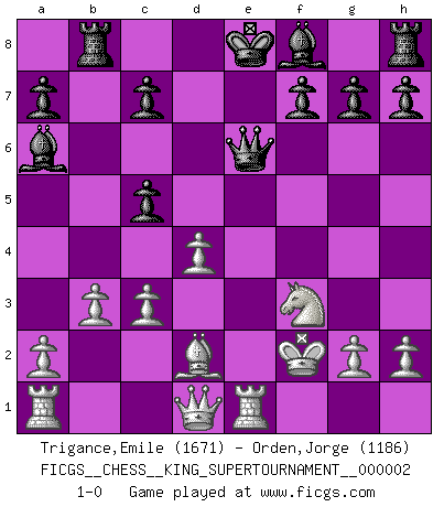 Last move : 1-0 2018 June 3 20:44:49 [Event "FICGS__CHESS__KING_SUPERTOURNAMENT__000002"] [Site "FICGS"] [Date "2018.05.01"] [Round "1"] [White "Trigance,Emile"] [Black "Orden,Jorge"] [Result "1-0"] [WhiteElo "1671"] [BlackElo "1186"] 1.e4 e5 2.f4 Nc6 3.Nf3 d6 4.Bb5 Nf6 5.fxe5 dxe5 6.Nxe5 Qd6 7.Bxc6+ bxc6 8.d4 Nxe4 9.c3 Qf6 10.Nf3 Ba6 11.Nbd2 Nxd2 12.Bxd2 Rb8 13.b3 Qe6+ 14.Kf2 c5 15.Re1 1-0 King's gambit Player White won this chess game. Follow this game move after move (download)Don't even mention losing to me. I can't stand to think of it. (Bobby Fischer) Auf jeden Fall musst du zuerst Rechtsanwalt werden, damit du deine eigenen Interessen und die deiner Familie vertreten kannst. [Brief an seinen Sohn] (José Raúl Capablanca) Yo no le temo a Spassky. Todos saben que yo soy el mejor. Uno no necesita un torneo para probarlo. (Bobby Fischer) Seul un grand joueur sait à quel point il joue faiblement. (Xavier Tartacover) To be champion requires more than simply being a strong player; one has to be a strong human being as well. (Anatoly Karpov)