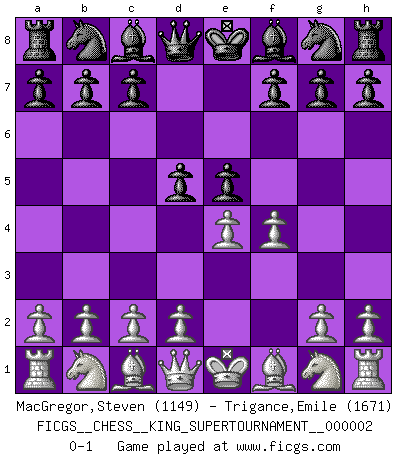 Last move : 0-1 2018 June 1 12:40:23 [Event "FICGS__CHESS__KING_SUPERTOURNAMENT__000002"] [Site "FICGS"] [Date "2018.05.01"] [Round "1"] [White "MacGregor,Steven"] [Black "Trigance,Emile"] [Result "0-1"] [WhiteElo "1149"] [BlackElo "1671"] 1.e4 e5 2.f4 d5 0-1 This chess game has been lost on time (started : 2018.05.01 22:10:15) KGD : Falkbeer counter-gambit Player Black won this chess game. Follow this game move after move (download)Chess is a fairy tale of 1001 blunders. (Savielly Tartakower) Schach verlangt totale Konzentration. (Robert James Fischer) En un gambito tu regalas un Peón por el bién de tomar un juego perdido. (Samuel Standige Boden) Ne tendez aucun piège pour le plaisir ! Ne jouez rien dans l'espoir que l'adversaire réagisse de façon stupide ! Prenez toujours pour acquis que l'adversaire va trouver le meilleur coup ! Ne jouez jamais de coup dans l'espoir que l'adversaire ne voie pas la menace ! Chacun de vos coups doit améliorer la position d'une façon ou d'une autre. Programmer - an organism that turns coffee into software. (Anonymous)