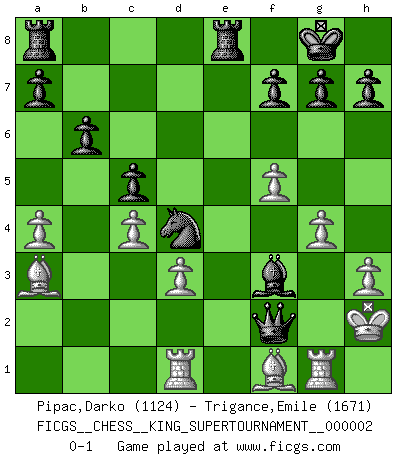 Last move : 0-1 2018 July 4 17:29:35 [Event "FICGS__CHESS__KING_SUPERTOURNAMENT__000002"] [Site "FICGS"] [Date "2018.05.01"] [Round "1"] [White "Pipac,Darko"] [Black "Trigance,Emile"] [Result "0-1"] [WhiteElo "1124"] [BlackElo "1671"] 1.e4 e5 2.f4 d5 3.exd5 e4 4.Nc3 Nf6 5.d3 Bb4 6.a3 Bxc3+ 7.bxc3 Qxd5 8.c4 Qd4 9.Rb1 Ng4 10.Qe2 O-O 11.h3 exd3 12.cxd3 Nf6 13.Nf3 Qd6 14.Qc2 Nh5 15.a4 Ng3 16.Rg1 Re8+ 17.Kf2 Qe6 18.Kxg3 c5 19.Bb2 Qg6+ 20.Kf2 Nc6 21.Ba3 b6 22.g4 Bb7 23.f5 Qh6 24.Rd1 Qe3+ 25.Kg2 Nd4 26.Qf2 Bxf3+ 27.Kh2 Qxf2+ 0-1 KGD : Falkbeer, 3...e4 Kingside Castling by player Black (move 10) Player Black won this chess game. Follow this game move after move (download)Help your pieces so they can help you. (Paul Morphy) Wenn Dein Gegner dir ein Remis anbietet, versuch herauszufinden, weshalb er glaubt schlechter zu stehen. (Nigel Short) Al jugar al Ajedrez entonces, podemos aprender: Primero: Previsión... Segundo: Prudencia... Tercero: Cautela... Y al final, aprendemos del Ajedrez el hábito de no ser desanimados por apariencias malas presentes en el estado de nuestros asuntos, el hábito de la esperanza por una oportunidad favorable y la perseveración de los secretos de los recursos. (Benjamin Franklin) Ce qui est bien, c'est d'avoir tout un tas de pièces en prise : l'adversaire ne peut en prendre qu'une à la fois. Cité par Thierry Audin. Don't anthropomorphize computers - they hate it. (Anonymous)