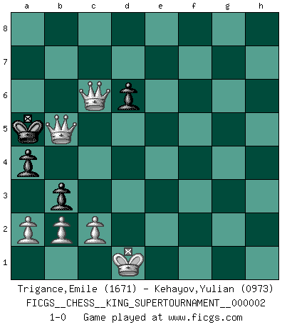 Last move : 1-0 2018 July 6 10:46:47 [Event "FICGS__CHESS__KING_SUPERTOURNAMENT__000002"] [Site "FICGS"] [Date "2018.05.01"] [Round "1"] [White "Trigance,Emile"] [Black "Kehayov,Yulian"] [Result "1-0"] [WhiteElo "1671"] [BlackElo "0973"] 1.e4 e5 2.f4 f5 3.exf5 exf4 4.Qh5+ Ke7 5.Bc4 Nf6 6.Qf7+ Kd6 7.d4 Qe7+ 8.Qxe7+ Bxe7 9.Bxf4+ Kc6 10.Nc3 Bd6 11.Bb5+ Kb6 12.Bxd6 cxd6 13.O-O-O Nc6 14.Nf3 a6 15.Bd3 d5 16.Rhe1 d6 17.h3 Nb4 18.g4 Nxd3+ 19.Rxd3 g6 20.fxg6 hxg6 21.Ng5 Nh7 22.Nxh7 Rxh7 23.Nxd5+ Ka7 24.Re7 Rxe7 25.Nxe7 Be6 26.Nxg6 Rg8 27.Nf4 Bc4 28.Re3 Rf8 29.Nd3 Bxd3 30.Rxd3 Rf1+ 31.Rd1 Rxd1+ 32.Kxd1 Kb6 33.g5 Kc6 34.g6 Kd5 35.g7 Kxd4 36.g8Q Kc5 37.h4 b5 38.h5 a5 39.h6 a4 40.h7 b4 41.h8Q b3 42.Qc3+ Kb5 43.Qb8+ Ka6 44.Qc6+ Ka5 45.Qb8b5+ 1-0 King's gambit Queenside Castling by player White (move 13) 10 pieces endgame at move 35 : White KPPPPP , Black KPPP WHITE : King + 5 Pawns BLACK : King + 3 Pawns Promotion Queen by player White (move 36) Promotion Queen by player White (move 41) Player White won this chess game. Follow this game move after move (download)Every Pawn is a potential Queen. (James Mason) Schach ist Kampf, hauptsächlich jedoch gegen die eigenen Fehler. (Savielly Grigorievitsch Tartakower) El Ajedrez es como la guerra en un tablero. (Bobby Fischer) Les Echecs sont et restent toujours un combat, un combat intégral comme la boxe, la lutte ou un autre sport, et où il doit y avoir un vainqueur et un vaincu. (Joseph Emil Diemer) Indecision is the key to flexibility. (Unknown)