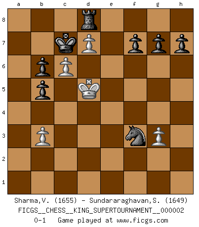 Last move : 0-1 2018 July 1 5:58:19 [Event "FICGS__CHESS__KING_SUPERTOURNAMENT__000002"] [Site "FICGS"] [Date "2018.05.01"] [Round "1"] [White "Sharma,Vivek"] [Black "Sundararaghavan,Shailesh"] [Result "0-1"] [WhiteElo "1655"] [BlackElo "1649"] 1.e4 e5 2.f4 d5 3.fxe5 Qh4+ 4.g3 Qxe4+ 5.Qe2 Qxh1 6.Nf3 Bg4 7.Qb5+ Nd7 8.Qxb7 Rb8 9.Qxd5 Qxf3 10.Qxf3 Bxf3 11.d4 Ne7 12.Nd2 Bd5 13.c4 Bb7 14.Nb3 Nc6 15.Bf4 Bb4+ 16.Bd2 Bxd2+ 17.Kxd2 Ne7 18.c5 Rd8 19.Bb5 Bc6 20.Bc4 Nxe5 21.Kc3 Nxc4 22.Kxc4 Bd5+ 23.Kc3 Bxb3 24.axb3 Ra8 25.Re1 Kd7 26.b4 Rhe8 27.Ra1 Nd5+ 28.Kc4 c6 29.b5 Ne3+ 30.Kb3 cxb5 31.Ra6 Kc7 32.Kb4 Reb8 33.b3 Nc2+ 34.Kc3 Ne3 35.Kb4 Nf1 36.c6 Nxh2 37.Kc5 Nf3 38.d5 Rb6 39.d6+ Kc8 40.d7+ Kc7 41.Rxb6 axb6+ 42.Kd5 Rd8 0-1 KGD : Falkbeer counter-gambit Player Black won this chess game. Follow this game move after move (download)Chess is thirty to forty percent psychology. You don't have this when you play a computer. I can't confuse it. (Judith Polgar) Spielt Blackmar-Diemer-Gambit, und das Matt kommt von selbst! (Emil Joseph Diemer) Evita las multitudes. Haz independientemente tu propio razonamiento. Trata de ser el jugador de Ajedrez, no la pieza de Ajedrez. (Ralph Charell) À la honte des hommes, on sait que les lois du jeu sont les seules qui soient partout justes, claires, inviolables et exécutées. Pourquoi l'Indien qui a donné les règles du jeu d'échecs est-il obéi de bon gré dans toute la terre, et que les décrétales des papes, par exemple, sont aujourd'hui un objet d'horreur et de mépris ? C'est que l'inventeur des échecs combina tout avec justesse pour la satisfaction des joueurs, et que les papes, dans leurs décrétales, n'eurent en vue que leur seul avantage. L'Indien voulut exercer également l'esprit des hommes et leur donner du plaisir; les papes ont voulu abrutir l'esprit des hommes. Voltaire (Dictionnaire philosophique / Garnier 1967) You think that education is too expensive ? Try ignorance. (Derek Bok)
