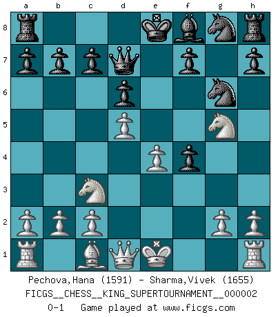 Last move : 0-1 2018 June 14 5:46:56 [Event "FICGS__CHESS__KING_SUPERTOURNAMENT__000002"] [Site "FICGS"] [Date "2018.05.01"] [Round "1"] [White "Pechova,Hana"] [Black "Sharma,Vivek"] [Result "0-1"] [WhiteElo "1591"] [BlackElo "1655"] 1.e4 e5 2.f4 Nc6 3.Nf3 exf4 4.Nc3 d6 5.d4 g5 6.d5 Ne5 7.Bb5+ Bd7 8.Bxd7+ Qxd7 9.Nxg5 Ng6 0-1 King's gambit Player Black won this chess game. Follow this game move after move (download)He who takes the Queen's Knight's Pawn will sleep in the streets. (Anonymous) Im Fernschach kannst du während dem Spiel rauchen. (John Christen Knudsen) El arma más poderosa en el Ajedrez, es tener la próxima movida. (David Bronstein) Mais l'homme est une créature légère et illogique : semblable au joueur d'échecs, il n'aime que le processus du but à atteindre, non le but lui-même. (Dostoïevsky) A specialist learns more and more about less and less until he knows everything about nothing. (Nicholas Murray Butler)