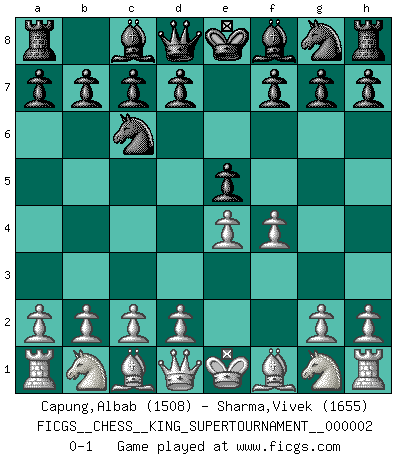 Last move : 0-1 2018 June 1 12:40:23 [Event "FICGS__CHESS__KING_SUPERTOURNAMENT__000002"] [Site "FICGS"] [Date "2018.05.01"] [Round "1"] [White "Capung,Albab"] [Black "Sharma,Vivek"] [Result "0-1"] [WhiteElo "1508"] [BlackElo "1655"] 1.e4 e5 2.f4 Nc6 0-1 This chess game has been lost on time (started : 2018.05.01 22:10:15) King's gambit Player Black won this chess game. Follow this game move after move (download)I like the moment when I break a man's ego. (Bobby Fischer) Fallen sollten polizeilich verboten werden. (Savielly Grigorievitsch Tartakower) Los finales de Peón son del Ajedrez lo que el cesped es del Golf. (Cecil Purdy) Le jeu d'échecs fait naître et fortifie en nous plusieurs qualités précieuses dans le cours de l'existence, telles que la prévoyance, la circonspection, la prudence, et la persévérance. (Benjamin Franklin - 1783, la morale des échecs) Do you know these so called Volunteers don't even get paid! (Simpsons)