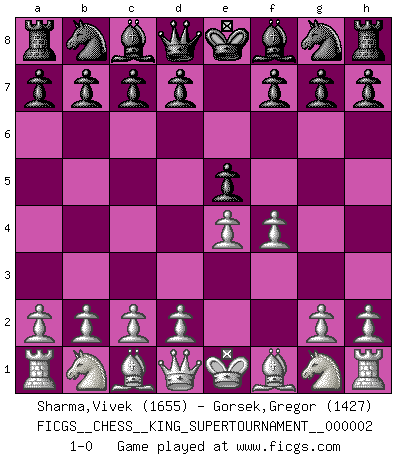 Last move : 1-0 2018 June 1 0:38:7 [Event "FICGS__CHESS__KING_SUPERTOURNAMENT__000002"] [Site "FICGS"] [Date "2018.05.01"] [Round "1"] [White "Sharma,Vivek"] [Black "Gorsek,Gregor"] [Result "1-0"] [WhiteElo "1655"] [BlackElo "1427"] 1.e4 e5 2.f4 1-0 This chess game has been lost on time (started : 2018.05.01 22:10:15) King's gambit Player White won this chess game. Follow this game move after move (download)Let the perfectionist play postal. (Yasser Seirawan) Ich habe die Schachforschung dermaßen betrieben, dass sie auf eine wissenschaftliche Basis gestellt wurde. (Mikhail Moiseyevich Botvinik) El ganador de una partida es aquel jugador que hace el penúltimo error. (Savielly Tartakover) Aucun coup ne doit être joué sans but. (Pedro Damiano) When it is a question of money, everybody is of the same religion. (Voltaire)