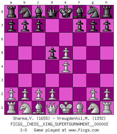 Last move : 1-0 2018 June 2 12:44:50 [Event "FICGS__CHESS__KING_SUPERTOURNAMENT__000002"] [Site "FICGS"] [Date "2018.05.01"] [Round "1"] [White "Sharma,Vivek"] [Black "Vreugdenhil,Maarten"] [Result "1-0"] [WhiteElo "1655"] [BlackElo "1392"] 1.e4 e5 2.f4 d5 3.fxe5 1-0 This chess game has been lost on time (started : 2018.05.01 22:10:15) KGD : Falkbeer counter-gambit Player White won this chess game. Follow this game move after move (download)A strong memory, concentration, imagination, and a strong will is required to become a great Chess player. (Bobby Fischer) Frage: Gibt es etwas was Sie mehr lieben als Autobahnen ohne Tempobegrenzungen? - Antwort: Deutsche Frauen ohne Tempobegrenzungen. (Loek van Wely) Uno por uno, yo los acribillé, mi superioridad muy pronto se volvio aparente. (Jose Capablanca) Les erreurs sont comme les malheurs, elles n'arrivent jamais seules. (Siegbert Tarrasch) Treat your password like your toothbrush. Don't let anybody else use it, and get a new one every six months. (Clifford Stoll)