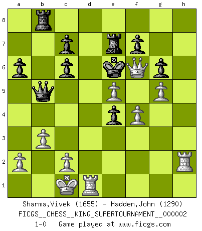 Last move : 1-0 2018 June 25 5:12:6 [Event "FICGS__CHESS__KING_SUPERTOURNAMENT__000002"] [Site "FICGS"] [Date "2018.05.01"] [Round "1"] [White "Sharma,Vivek"] [Black "Hadden,John"] [Result "1-0"] [WhiteElo "1655"] [BlackElo "1290"] 1.e4 e5 2.f4 d5 3.d4 exd4 4.Qxd4 Nc6 5.Bb5 a6 6.Bxc6+ bxc6 7.Nc3 Ne7 8.e5 Bf5 9.Qa4 g6 10.Be3 Bg7 11.O-O-O O-O 12.Bc5 Bd7 13.Nf3 Re8 14.Ng5 h6 15.Nf3 Nf5 16.g4 Ne7 17.Bxe7 Rxe7 18.g5 hxg5 19.Nxg5 Bh6 20.h4 Qc8 21.Qd4 Bg4 22.Rd2 Rb8 23.Qc5 Qb7 24.b3 Rd7 25.Re1 Bxg5 26.hxg5 Qb6 27.Na4 Qb5 28.Rg2 Bf5 29.Rh2 Be4 30.Qf2 Kf8 31.Nc5 Re7 32.Nxe4 dxe4 33.Qh4 Ke8 34.Qh8+ Kd7 35.Rd1+ Ke6 36.Qf6+ 1-0 KGD : Falkbeer counter-gambit Queenside Castling by player White (move 11) Kingside Castling by player Black (move 11) Player White won this chess game. Follow this game move after move (download)Chess is a part of culture and if a culture is declining then Chess too will decline. (Mikhail Botvinnik) Bis jetzt ist Weiß einer wohlbekannten Analyse gefolgt. Aber jetzt begeht er einen schrecklichen Fehler: Er beginnt seinen eigenen Kopf zu benutzen. (Siegbert Tarrasch) Tu eres para mi la Reina en d8 y yo soy el Peón en d7!!. (GM Eduard Gufeld) L'attaque fait le spectacle, la défense gagne les matchs. (Dicton footballistique) I've lost money so fast in these clubs it's left me reeling. I've read every poker book ever written, but the only way to get better at the game is to go out and play with people who are really good. The problem is, you stand to lose a lot of money doing it. (Matt Damon)