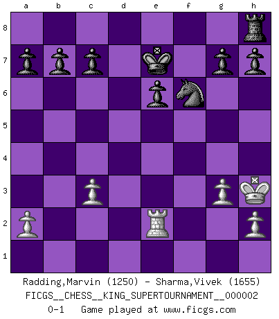 Last move : 0-1 2018 May 23 2:10:50 [Event "FICGS__CHESS__KING_SUPERTOURNAMENT__000002"] [Site "FICGS"] [Date "2018.05.01"] [Round "1"] [White "Radding,Marvin"] [Black "Sharma,Vivek"] [Result "0-1"] [WhiteElo "1250"] [BlackElo "1655"] 1.e4 e5 2.f4 Nc6 3.Nf3 d5 4.exd5 Qxd5 5.Nc3 Qe6 6.Bb5 exf4 7.Qe2 Bd7 8.Qxe6+ fxe6 9.O-O Bc5+ 10.Kh1 O-O-O 11.d3 Nd4 12.Bxd7+ Rxd7 13.Bxf4 Nxc2 14.Rac1 Nb4 15.Rfd1 Nxd3 16.Rc2 Nxf4 17.Rxd7 Kxd7 18.Ne5+ Ke7 19.g3 Nh3 20.Kg2 Bd6 21.Kxh3 Bxe5 22.Re2 Bxc3 23.bxc3 Nf6 0-1 King's gambit Kingside Castling by player White (move 9) Queenside Castling by player Black (move 10) Player Black won this chess game. Follow this game move after move (download)Nothing excites jaded Grandmasters more than a theoretical novelty. (Dominic Lawson) Auf Remis zu spielen ist gewissermaßen ein Verbrechen gegen das Schachspiel. (Mikhail Nekhemyevich Tal) En el Ajedrez, tal como en la vida, las bendiciones de hoy pueden ser el veneno del mañana. (Assaic) Assurément je connaissais par expérience le mystérieux attrait de ce jeu royal, le seul entre tous les jeux inventés par les hommes qui échappe souverainement à la tyrannie du hasard, le seul où l'on ne doive sa victoire qu'à son intelligence ou plutôt à une certaine forme d'intelligence. Mais n'est-ce pas déjà le limiter injurieusement que d'appeler les échecs un jeu ? N'est-ce pas une science, un art ou quelque chose qui, comme le cercueil de Mahomet entre ciel et terre, est suspendu entre l'un et l'autre, et qui réunit un nombre incroyable de contraires ? [...] C'est une pensée qui ne mène à rien, une mathématique qui n'établit rien, un art qui ne laisse pas d'uvre, une architecture sans matière; et il l'a prouvé néanmoins qu'il était plus durable, à sa manière, que les livres ou que tout autre monument, ce jeu unique qui appartient à tous les peuples et à tous les temps, et dont personne ne sait quel dieu en fit don à la terre pour tuer l'ennui, pour aiguiser l'esprit et stimuler l'âme. Où commence-t-il, où finit-il ? (Stefan Zweig) Knowledge rests not upon truth alone, but upon error also. (Carl G. Jung)