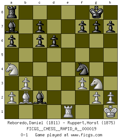 Last move : 0-1 2007 July 3 16:50:49 [Event "FICGS__CHESS__RAPID_A__000019"] [Site "FICGS"] [Date "2007.05.03"] [Round "1"] [White "Reboredo,Daniel"] [Black "Ruppert,Horst"] [Result "0-1"] [WhiteElo "1811"] [BlackElo "1875"] 1.b3 e5 2.Bb2 Nc6 3.e3 Nf6 4.Bb5 d6 5.d4 exd4 6.exd4 a6 7.Bxc6+ bxc6 8.Nf3 Qe7+ 9.Qe2 Nd5 10.Qxe7+ Bxe7 11.Nc3 Nf4 12.O-O Bg4 13.Nd2 O-O 14.Rfe1 Rfe8 15.Nf1 Bf6 16.f3 Bxd4+ 17.Kh1 Bf5 18.Na4 Ba7 19.Ng3 Rxe1+ 20.Rxe1 Bxc2 0-1 Nimzovich-Larsen attack : Modern variation Kingside Castling by player White (move 12) Kingside Castling by player Black (move 13) Player Black won this chess game. Follow this game move after move (download)The winner of the game is the player who makes the next-to-last mistake. (Savielly Tartakover) Mit sehr nachdenklichem Gesicht schreitet Bobby durch den Turniersaal. Was ist passiert?, fragt Lombardy. Ich stehe schlecht, antwortet Fischer. Lombardy: Dann biete doch einfach Remis an. Fischer: So schlecht stehe ich nun auch wieder nicht! (Robert James Fischer) La táctica fluye a partir de una posición superior. (Bobby Fischer) Les Echecs ont trois composantes : le temps, l'espace et le matériel en dernier. (Mikhail Tal) Wipe them out. All of them. (Darth Sidious in Star Wars ep.1)