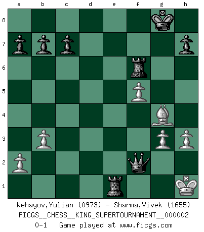 Last move : 0-1 2018 June 30 18:35:52 [Event "FICGS__CHESS__KING_SUPERTOURNAMENT__000002"] [Site "FICGS"] [Date "2018.05.01"] [Round "1"] [White "Kehayov,Yulian"] [Black "Sharma,Vivek"] [Result "0-1"] [WhiteElo "0973"] [BlackElo "1655"] 1.e4 e5 2.f4 Nc6 3.Nf3 Nf6 4.d3 d6 5.Be2 exf4 6.Nc3 d5 7.O-O d4 8.Nb5 Bd6 9.Nxd6+ Qxd6 10.Bd2 Ne5 11.Bxf4 Nfg4 12.Nxe5 Nxe5 13.Bg4 f6 14.c3 f5 15.exf5 Bd7 16.cxd4 Qxd4+ 17.Kh1 O-O 18.Bxe5 Qxe5 19.b3 Bc6 20.h3 Qg3 21.Qf3 Bxf3 22.Rxf3 Qe5 23.Rb1 Rf6 24.Rbf1 Qd5 25.Kh2 Qd4 26.R1f2 Rh6 27.Kg3 Qd6+ 28.Rf4 Qxd3+ 29.R4f3 Qd6+ 30.Rf4 Re8 31.R2f3 g5 32.Rf1 Rf6 33.Kh2 gxf4 34.Rxf4 Qxf4+ 35.g3 Qf2+ 36.Kh1 Re1+ 0-1 King's gambit Kingside Castling by player White (move 7) Kingside Castling by player Black (move 17) Player Black won this chess game. Follow this game move after move (download)The mistakes are there, waiting to be made. (Savielly Tartakower) Es genügt nicht ein guter Spieler zu sein, man muß auch gut spielen. (Siegbert Tarrasch) El Ajedrez, como cualquier actividad creativa, solo puede existir a través del esfuerzo combinado de aquellos que tienen talento creativo y de aquellos que poseen la habilidad de organizar su trabajo creativo. (Mikhail Botvinnik) J'ai toujours senti une vague pitié pour l'homme qui ne connaît rien aux échecs, tout comme j'en aurais pour un homme ignorant de l'amour. Les Echecs, comme la musique ou comme l'amour, ont le pouvoir de rendre heureux. (Siegbert Tarrasch) Memory is a crazy woman that hoards colored rags and throws away food. (Austin O'Malley)