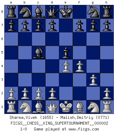 Last move : 1-0 2018 June 3 12:52:57 [Event "FICGS__CHESS__KING_SUPERTOURNAMENT__000002"] [Site "FICGS"] [Date "2018.05.01"] [Round "1"] [White "Sharma,Vivek"] [Black "Malish,Dmitriy"] [Result "1-0"] [WhiteElo "1655"] [BlackElo "0771"] 1.e4 e5 2.f4 Bc5 3.g3 1-0 This chess game has been lost on time (started : 2018.05.01 22:10:15) KGD : Classical variation Player White won this chess game. Follow this game move after move (download)I feel as if I were a piece in a game of Chess, when my opponent says of it: That piece cannot be moved. (Soren Kierkegaard) Schach ist das Spiel, das die Verrückten gesund hält. (Albert Einstein) El Peón aislado arroja penumbra sobre todo el tablero. (Aaron Nimzovich) À la honte des hommes, on sait que les lois du jeu sont les seules qui soient partout justes, claires, inviolables et exécutées. Pourquoi l'Indien qui a donné les règles du jeu d'échecs est-il obéi de bon gré dans toute la terre, et que les décrétales des papes, par exemple, sont aujourd'hui un objet d'horreur et de mépris ? C'est que l'inventeur des échecs combina tout avec justesse pour la satisfaction des joueurs, et que les papes, dans leurs décrétales, n'eurent en vue que leur seul avantage. L'Indien voulut exercer également l'esprit des hommes et leur donner du plaisir; les papes ont voulu abrutir l'esprit des hommes. Voltaire (Dictionnaire philosophique / Garnier 1967) Tree pose grows confidence. It roots me to this world. (Terri Guillemets)