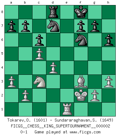 Last move : 0-1 2018 July 15 7:35:37 [Event "FICGS__CHESS__KING_SUPERTOURNAMENT__000002"] [Site "FICGS"] [Date "2018.05.01"] [Round "1"] [White "Tokarev,Oleg"] [Black "Sundararaghavan,Shailesh"] [Result "0-1"] [WhiteElo "1601"] [BlackElo "1649"] 1.e4 e5 2.f4 d5 3.exd5 Qxd5 4.fxe5 Qxe5+ 5.Qe2 Qxe2+ 6.Bxe2 Nf6 7.Nf3 Bc5 8.d4 Bd6 9.O-O O-O 10.c4 Bg4 11.Nc3 Bxf3 12.Bxf3 c6 13.Bg5 Nbd7 14.a3 h6 15.Be3 Rae8 16.Rae1 Rd8 17.h3 Rfe8 18.c5 Bg3 19.Bf2 Rxe1 20.Rxe1 Bxf2+ 21.Kxf2 Kf8 0-1 This chess game has been lost on time (started : 2018.05.01 22:10:15) KGD : Falkbeer counter-gambit Kingside Castling by player White (move 9) Kingside Castling by player Black (move 9) Player Black won this chess game. Follow this game move after move (download)I know people who have all the will in the world, but still can't play good Chess. (Bobby Fischer) Meine Liebe ist Schach, Schach, Schach. Ich muss jeden Tag Schach spielen, deshalb fühle ich mich so stark. (Miguel Najdorf) El Ajedrez es el juego mas altamente simbólico, pero las agresiones estan por lo tanto aún mas francamente representadas en la partida. Tal vez comenzo como un juego de guerra; Algo como la representación de una batalla en miniatura entre las fuerzas de dos reinos. (Karl Meninger) Vous savez, camarade Pachman, je n'éprouve pas de plaisir à être ministre, je jouerais plutôt aux échecs comme vous, ou alors ferais une révolution au Venezuela. (Che Guevara à Ludek Pachman, 'Checkmate in Prague', 1975) The message for business people contemplating their place in the cyberspace is simple and direct: get linked or get lost. (Vic Sussman and Kenan Pollack)