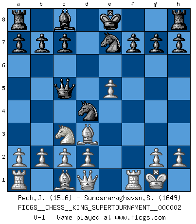 Last move : 0-1 2018 June 26 16:4:44 [Event "FICGS__CHESS__KING_SUPERTOURNAMENT__000002"] [Site "FICGS"] [Date "2018.05.01"] [Round "1"] [White "Pech,Jaroslav"] [Black "Sundararaghavan,Shailesh"] [Result "0-1"] [WhiteElo "1516"] [BlackElo "1649"] 1.e4 e5 2.f4 Nc6 3.Nf3 d5 4.exd5 Nd4 5.Nxe5 Bd6 6.Bd3 Bxe5 7.fxe5 Qxd5 8.O-O Ne7 9.Nc3 Qc5 0-1 This chess game has been lost on time (started : 2018.05.01 22:10:15) King's gambit Kingside Castling by player White (move 8) Player Black won this chess game. Follow this game move after move (download)When you don't know what to do, wait for your opponent to get an idea - it's sure to be wrong. (Tarrasch) Es ist peinlich, dass ich nie Weltmeister wurde. Es wäre leicht, Leonid Breschnjew als Ursache vorzuschieben, dessen Apparat den Vorzeigekommunisten Anatoli Karpow in allem unterstützte. Aber Garri Kasparow zum Beispiel, der ebenfalls von den Sowjets unerwünscht war, hat trotz der Widerstände den WM-Titel erobert. (Viktor Kortschnoi) Si el ingenio solamente fuese necesario para lucirse, las mujeres serían las mejores jugadoras de Ajedrez del mundo. (Albin) Un millionnaire : 'Monsieur Steinitz ! Vous ne participez aux tournois que pour l'argent, alors que moi je n'y viens que pour l'honneur.' Steinitz : 'Chacun joue pour ce qu'il n'a pas'... For a mechanic, you seem to do an excessive amount of thinking. (C-3PO in Star Wars ep.2)