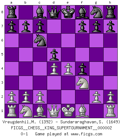 Last move : 0-1 2018 June 4 13:2:53 [Event "FICGS__CHESS__KING_SUPERTOURNAMENT__000002"] [Site "FICGS"] [Date "2018.05.01"] [Round "1"] [White "Vreugdenhil,Maarten"] [Black "Sundararaghavan,Shailesh"] [Result "0-1"] [WhiteElo "1392"] [BlackElo "1649"] 1.e4 e5 2.f4 Nc6 3.Nf3 exf4 4.d4 d5 0-1 This chess game has been lost on time (started : 2018.05.01 22:10:15) King's gambit Player Black won this chess game. Follow this game move after move (download)Bobby is the finest Chess player this country ever produced. His memory for the moves, his brilliance in dreaming up combinations, and his fierce determination to win are uncanny. (John Collins) Ein Schachspiel besteht aus drei Phasen: Die erste, wenn du hofftst den Vorteil zu haben, die zweite, wenn du glaubst einen Vorteil zu haben, und die dritte.... wenn du weißt Du wirst verlieren. (Savielly Grigorievitsch Tartakower) Tu puedes aprender mucho mas de una partida que pierdas que de una partida ganada. Tendras que perder cientos de partidas antes de llegar a ser un buen jugador. (Jose Raul Capablanca) Les erreurs sont comme les malheurs, elles n'arrivent jamais seules. (Siegbert Tarrasch) Methinks King Thibault should dub Marius Zubac a knight of the square board... I mean table, henceforth addressing him as Sir Marius, and bestow on him a suitable land from the kingdom of FICGS & marry him off to a worthy, fair maiden, lest he slice our heads with his mighty sword in his wrath. (Dinesh De Silva)