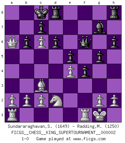 Last move : 1-0 2018 June 22 17:29:48 [Event "FICGS__CHESS__KING_SUPERTOURNAMENT__000002"] [Site "FICGS"] [Date "2018.05.01"] [Round "1"] [White "Sundararaghavan,Shailesh"] [Black "Radding,Marvin"] [Result "1-0"] [WhiteElo "1649"] [BlackElo "1250"] 1.e4 e5 2.f4 exf4 3.Nf3 d6 4.Bb5+ Nc6 5.d4 g5 6.d5 a6 7.dxc6 b6 8.Bc4 Be6 9.Bxe6 fxe6 10.O-O e5 11.Bd2 h6 12.Nc3 Nf6 13.Qe2 Qe7 14.Nd5 Qf7 15.Nxf6+ Qxf6 16.Bc3 Bg7 17.Nd2 O-O-O 18.Qxa6+ 1-0 KGA : Fischer defense Kingside Castling by player White (move 10) Queenside Castling by player Black (move 17) Player White won this chess game. Follow this game move after move (download)I am the best player in the world and I am here to prove it. (Bobby Fischer) Die Neutralität betrachte ich als eine schwere Krankheit. (Viktor Kortschnoi) Diferente gente reacciona diferentemente en aceptar la derrota. (Bobby Fischer) La vie et les Echecs sont tous les deux une lutte constante. (Lasker) Good luck. You're gonna need it. (Han Solo in Star Wars ep.6)