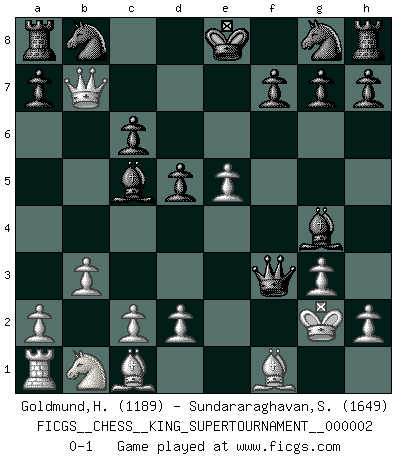 Last move : 0-1 2018 May 20 23:19:45 [Event "FICGS__CHESS__KING_SUPERTOURNAMENT__000002"] [Site "FICGS"] [Date "2018.05.01"] [Round "1"] [White "Goldmund,Heike"] [Black "Sundararaghavan,Shailesh"] [Result "0-1"] [WhiteElo "1189"] [BlackElo "1649"] 1.e4 e5 2.f4 d5 3.fxe5 Qh4+ 4.g3 Qxe4+ 5.Qe2 Qxh1 6.Nf3 Bg4 7.b3 Qxf3 8.Qb5+ c6 9.Qxb7 Qd1+ 10.Kf2 Bc5+ 11.Kg2 Qf3+ 0-1 KGD : Falkbeer counter-gambit Player Black won this chess game. Follow this game move after move (download)What is the object of playing a gambit opening?... To acquire a reputation of being a dashing player at the cost of losing a game. (Siegbert Tarrasch) Stil? Ich habe keinen Stil! (Anatoly Karpov) Si yo gano un torneo, yo lo gano por mí mismo. Yo hago las jugadas. Nadie me ayuda. (Bobby Fischer) Seul un grand joueur sait à quel point il joue faiblement. (Xavier Tartacover) Never risk one's whole fortune unless supported by one's entire army. (Niccolo Machiavelli)