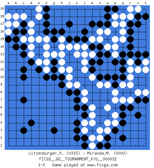 Last move : 1-0 2007 May 12 17:37:31 [Event "FICGS__GO__TOURNAMENT_KYU__000032"] [Site "FICGS"] [Date "2007.05.04"] [Round "1"] [Black "Litzenburger,Xavier"] [White "Miranda,Marcus"] [Result "1-0"] [Rating 1 "0315"] [Rating 2 "0000"] 1.d4 q16 2.q4 d16 3.f17 e18 4.c14 f15 5.c17 d17 6.c16 c18 7.c10 r10 8.o17 q18 9.j17 r7 10.k3 o6 11.r14 r12 12.r17 p17 13.r16 p15 14.m17 o4 15.p3 n3 16.q6 q7 17.r6 p7 18.q13 n15 19.g3 f13 20.j15 h13 21.o13 k13 22.p10 q9 23.c7 m13 24.n14 m15 25.m14 l14 26.l15 o14 27.n13 p13 28.p12 p14 29.q12 o16 30.n17 n16 31.l16 q17 32.o18 q15 33.r15 r18 34.k6 m2 35.d12 d14 36.c13 c15 37.b15 d15 38.f10 h11 39.h9 k9 40.j8 l8 41.m12 l13 42.n12 m10 43.n10 n9 44.o10 o9 45.c3 m4 46.k2 m6 47.o2 p5 48.q5 l3 49.k4 l4 50.l5 m5 51.l6 l7 52.k7 j10 53.g16 h15 54.h16 f11 55.e11 l12 56.f18 e19 57.f19 b18 58.b16 a18 59.s12 r11 60.r13 s11 61.t13 t11 62.s18 s19 63.t18 r19 64.h10 j11 65.g11 f12 66.g12 g13 67.g15 h14 68.p9 p8 69.q10 r9 70.s7 s8 71.t7 t8 72.s5 o3 73.n1 n2 74.o1 p4 75.q2 h12 76.g10 f14 77.p19 p18 78.o19 t12 79.s13 a16 80.a15 a17 81.m11 l11 82.q11 e12 83.c11 d13 84.l1 m1 85.l2 b17 86.b14 j14 87.k15 k14 88.f16 e15 89.s17 j9 90.k8 1-0 Comment by player 2 : Marcus Miranda : Yeah! it is finished, I will resign after your move. thanks for the game. Here are the names of the openings (joseki) played in the four corners : Corner d16 : d16 f17 Hoshi (Hwajeom, Seongjeom, Xingwei`) 4-4 Point. The star or hoshi (4-4) point, emphasizing influence at the potential expense of territory. Ikken Kakari (Hankan Keolch'im, Yi Gua`jiao~, 1-Space Low Approach). Black 2 is the standard approach move to the 4-4. Corner q16 : q16 o17 Hoshi (Hwajeom, Seongjeom, Xingwei`) 4-4 Point. The star or hoshi (4-4) point, emphasizing influence at the potential expense of territory. Ikken Kakari (Hankan Keolch'im, Yi Gua`jiao~, 1-Space Low Approach). Black 2 is the standard approach move to the 4-4. Corner q4 : q4 r7 Hoshi (Hwajeom, Seongjeom, Xingwei`) 4-4 Point. The star or hoshi (4-4) point, emphasizing influence at the potential expense of territory. Nikken Kakari (Dukan Keolch'im, E`r Gua`jiao~, 2-Space Low Approach). Black typically answers by 7-3 or 3-5 (which is not joseki). Player Black won this Go (weiqi, baduk) game. Follow this game move after move (download)If you don't know ladders, don't play go. (Anonymous) Unless in communicating with it one says exactly what one means, trouble is bound to result. (Alan Turing, about computers)