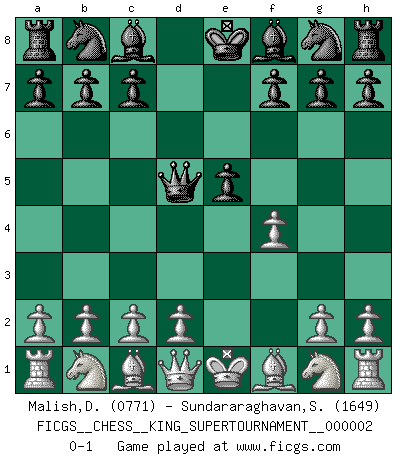 Last move : 0-1 2018 June 2 12:44:50 [Event "FICGS__CHESS__KING_SUPERTOURNAMENT__000002"] [Site "FICGS"] [Date "2018.05.01"] [Round "1"] [White "Malish,Dmitriy"] [Black "Sundararaghavan,Shailesh"] [Result "0-1"] [WhiteElo "0771"] [BlackElo "1649"] 1.e4 e5 2.f4 d5 3.exd5 Qxd5 0-1 This chess game has been lost on time (started : 2018.05.01 22:10:15) KGD : Falkbeer counter-gambit Player Black won this chess game. Follow this game move after move (download)One of these modest little moves may be more embarrassing to your opponent than the biggest threat. (Siegbert Tarrasch) Im Wettkampf zwischen starken Meistern kommen Fehler sehr selten vor, deshalb ist es mit bloßem Warten nicht getan. (José Raúl Capablanca) Tu sabes, camarada Pachman, no disfruto el ser un Ministro, preferería jugar al Ajedrez como tu. (Che Guevara) Je crois qu'il existe des manières très spécifiques de jouer efficacement contre une machine. Evidemment, nous n'avons aucune chance en technique pure, parce que l'ordinateur calcule de manière parfaite. Mais lorsque nous faisons appel à notre cerveau, en utilisant l'intuition et la compréhension, alors nous restons beaucoup plus forts. (Anatoli Karpov) Somehow our devils are never quite what we expect when we meet them face to face. (Nelson DeMille)