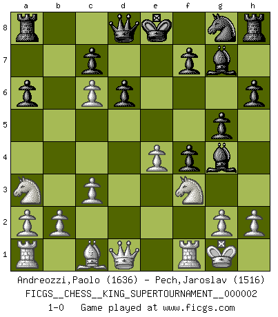 Last move : 1-0 2018 June 19 15:20:59 [Event "FICGS__CHESS__KING_SUPERTOURNAMENT__000002"] [Site "FICGS"] [Date "2018.05.01"] [Round "1"] [White "Andreozzi,Paolo"] [Black "Pech,Jaroslav"] [Result "1-0"] [WhiteElo "1636"] [BlackElo "1516"] 1.e4 e5 2.f4 Nc6 3.Nf3 d6 4.Bb5 exf4 5.d4 g5 6.d5 a6 7.Bxc6+ bxc6 8.O-O Bg7 9.c3 h6 10.dxc6 Bg4 11.Na3 1-0 This chess game has been lost on time (started : 2018.05.01 22:10:15) King's gambit Kingside Castling by player White (move 8) Player White won this chess game. Follow this game move after move (download)It's always better to sacrifice your opponent's men. (Savielly Tartakover) Später, ... hatte ich zunehmend Erfolg in entscheidenden Partien. Vielleicht weil ich eine einfache Wahrheit erkannte: nicht nur ich hatte Angst, auch mein Gegner. (Mikhail Nekhemyevich Tal) El Ajedrez se juega con la mente... ¡no con las manos!. (Renaud y Kahn) Des combinaisons [dans le jeu d'échecs] pareilles à des mélodies. Je crois entendre pour ainsi dire la musique des coups... (Vladimir Nabokov) The various flowers seem good to different people. (Chinese proverb)