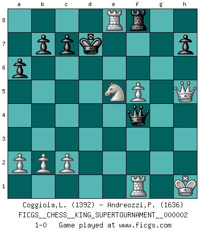 Last move : 1-0 2018 June 15 15:11:26 [Event "FICGS__CHESS__KING_SUPERTOURNAMENT__000002"] [Site "FICGS"] [Date "2018.05.01"] [Round "1"] [White "Coggiola,Leandro Damian"] [Black "Andreozzi,Paolo"] [Result "1-0"] [WhiteElo "1392"] [BlackElo "1636"] 1.e4 e5 2.f4 d6 3.Nf3 Nc6 4.Bb5 Bd7 5.O-O a6 6.Bxc6 Bxc6 7.Nc3 f5 8.exf5 Nf6 9.fxe5 dxe5 10.Nxe5 Qd4+ 11.Kh1 Bxg2+ 12.Kxg2 Bd6 13.Nf3 Qg4+ 14.Kh1 O-O-O 15.d4 Nh5 16.Ng1 Ng3+ 17.hxg3 Qxg3 18.Qh5 Rhf8 19.Bg5 Rf6 20.Bxf6 gxf6 21.Ne4 Qe3 22.Nxf6 Qxd4 23.Ng4 Qe4+ 24.Nf3 Rf8 25.Rae1 Qf4 26.Re8+ Kd7 27.Nfe5+ Bxe5 28.Nxe5+ 1-0 King's gambit Kingside Castling by player White (move 5) Queenside Castling by player Black (move 14) Player White won this chess game. Follow this game move after move (download)I look one move ahead... the best ! (Siegbert Tarrasch) Ich rechne überhaupt nicht voraus. Ich gewinne auch so. (Robert James Fischer) Las ideas audaces son como las piezas del Ajedrez que avanzan hacia adelante. Ellas pueden ser vencidas, pero también pueden iniciar una partida victoriosa. (Goethe) Aucun coup ne doit être joué sans but. (Pedro Damiano) All maxims have their antagonist maxims; proverbs should be sold in pairs, a single one being but a half truth. (William Mathews)