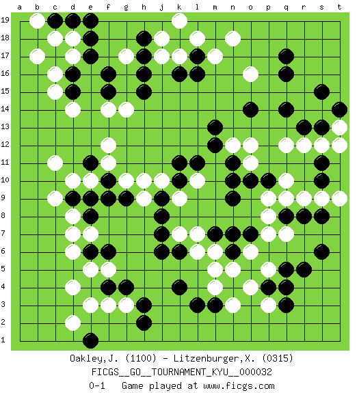 Last move : 0-1 2007 May 29 16:26:30 [Event "FICGS__GO__TOURNAMENT_KYU__000032"] [Site "FICGS"] [Date "2007.05.04"] [Round "1"] [Black "Oakley,Johnny"] [White "Litzenburger,Xavier"] [Result "0-1"] [Rating 1 "1100"] [Rating 2 "0315"] 1.q16 d4 2.q3 d17 3.d15 c15 4.d16 c16 5.e17 d18 6.f16 d14 7.r5 o16 8.l16 g17 9.e18 k17 10.l17 l18 11.q14 n18 12.k16 j17 13.h15 f14 14.f15 c11 15.k4 r12 16.r13 q12 17.r8 r9 18.q8 q9 19.q17 g3 20.o14 n3 21.l3 n5 22.n7 m6 23.k6 l7 24.n9 k7 25.j6 l10 26.n11 o12 27.m13 n12 28.m12 o11 29.n10 s9 30.s8 g14 31.h16 g10 32.j7 k9 33.g4 f3 34.h3 d6 35.e6 e5 36.f6 d8 37.f4 e3 38.h2 m17 39.h18 j18 40.h17 k19 41.s11 s12 42.s10 t9 43.p10 p9 44.o10 p8 45.o7 q7 46.s6 p7 47.l11 p5 48.q5 o6 49.p4 o4 50.n6 m5 51.m7 l6 52.g9 h10 53.j9 j10 54.e9 d10 55.f10 f11 56.e11 e10 57.f9 f12 58.e1 d2 59.d9 c9 60.d19 c18 61.c19 b19 62.e19 b17 63.s13 t13 64.t14 t12 65.s15 q10 66.e8 d7 67.k11 h9 68.j8 f5 69.k10 e7 70.m3 p3 71.q4 m4 0-1 Here are the names of the openings (joseki) played in the four corners : Corner d16 : d17 d15 Komoku (Somok, Xiao~mu`) 3-4 Point. The komoku (3-4) point is the traditional corner enclosure move.. Ikken Takagakari (Hankan Nop'dakeolch'im, Yi Gaogua`jiao~, 1-Space High Approach). The 5-4 approach move has become more popular in modern times, as modern Go emphasizes speed and influence. Corner q16 : q16 o16 Hoshi (Hwajeom, Seongjeom, Xingwei`) 4-4 Point. The star or hoshi (4-4) point, emphasizing influence at the potential expense of territory. Ikken Takagakari (Hankan Nop'dakeolch'im, Yi Gaojia, 1-Space High Approach). Black typically responds at 6-4 or 3-10. Black 4-10 is played when Black finds play on the right side advantageous. Black 4-8 or 3-8 may be played when Black has support at top. Player White won this Go (weiqi, baduk) game. Follow this game move after move (download)Very few good moves are played. (Pierre Audouard) Whoever said the pen is mightier than the sword obviously never encountered automatic weapons. (US General Douglas MacArthur)