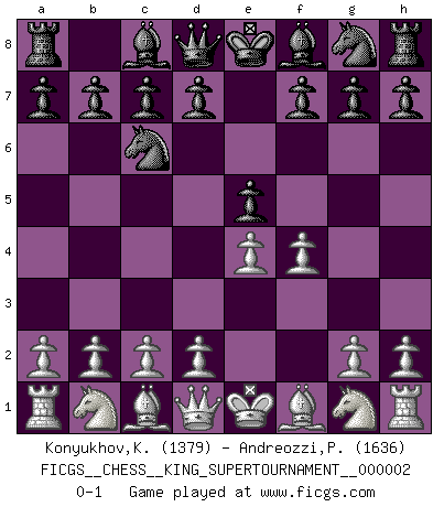 Last move : 0-1 2018 June 6 1:5:14 [Event "FICGS__CHESS__KING_SUPERTOURNAMENT__000002"] [Site "FICGS"] [Date "2018.05.01"] [Round "1"] [White "Konyukhov,Konstantin"] [Black "Andreozzi,Paolo"] [Result "0-1"] [WhiteElo "1379"] [BlackElo "1636"] 1.e4 e5 2.f4 Nc6 0-1 This chess game has been lost on time (started : 2018.05.01 22:10:15) King's gambit Player Black won this chess game. Follow this game move after move (download)Chess is a fairy tale of 1001 blunders. (Savielly Tartakower) Wenn sie aufgeben, dann danke ich Ihnen für das Spiel (Eventualzug beim Fernschach). (Anonymous) La pasion por jugar al Ajedrez es una de las mas inexplicables en el mundo. (H.G. Wells) Les erreurs sont comme les malheurs, elles n'arrivent jamais seules. (Siegbert Tarrasch) A computer lets you make more mistakes faster than any invention in human history - with the possible exceptions of handguns and tequila. (Mitch Ratcliffe)