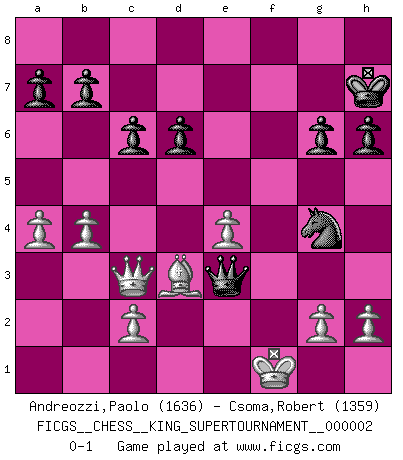 Last move : 0-1 2018 June 12 22:26:49 [Event "FICGS__CHESS__KING_SUPERTOURNAMENT__000002"] [Site "FICGS"] [Date "2018.05.01"] [Round "1"] [White "Andreozzi,Paolo"] [Black "Csoma,Robert"] [Result "0-1"] [WhiteElo "1636"] [BlackElo "1359"] 1.e4 e5 2.f4 Nf6 3.Nf3 Bc5 4.Nc3 Ng4 5.d4 exd4 6.Nxd4 d6 7.f5 Ne5 8.Be3 O-O 9.Be2 Bxd4 10.Bxd4 Qg5 11.Bf3 Nbc6 12.O-O Nxd4 13.Qxd4 Nc6 14.Qd5 Ne7 15.Qd3 Nc6 16.Nd5 Ne5 17.Qc3 c6 18.Ne3 Qe7 19.Be2 Bd7 20.f6 gxf6 21.Nf5 Bxf5 22.Rxf5 Kh8 23.Raf1 Rg8 24.Rxf6 Rg6 25.Rxg6 fxg6 26.Bc4 Rf8 27.Rxf8+ Qxf8 28.Be2 Qf4 29.Bd3 Qe3+ 30.Kf1 h6 31.b4 Kh7 32.a4 Ng4 0-1 KGD : 2...Nf6 Kingside Castling by player Black (move 8) Kingside Castling by player White (move 12) Player Black won this chess game. Follow this game move after move (download)White lost because he failed to remember the right continuation and had to think up the moves himself. (Siegbert Tarrasch) Der beste Spieler in einem Turnier gewinnt es nie. Er landet auf Platz zwei oder drei. (Siegbert Tarrasch) Coloca el contenido de las piezas del Ajedrez en un sombrero, agitalo vigorosamente, arrojalas en un tablero desde una altura de 30 centimetros y así obtendras el estilo de Steinitz. (H. E. Bird) Que feriez-vous si vous étiez en train de jouer aux échecs et que la fin du monde arrive ? Je continuerais à jouer. (Saint Borromée) Children in the dark cause accidents, accidents in the dark cause children. (Unknown)