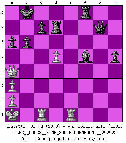 Last move : 0-1 2018 June 25 15:3:40 [Event "FICGS__CHESS__KING_SUPERTOURNAMENT__000002"] [Site "FICGS"] [Date "2018.05.01"] [Round "1"] [White "Klawitter,Bernd"] [Black "Andreozzi,Paolo"] [Result "0-1"] [WhiteElo "1300"] [BlackElo "1636"] 1.e4 e5 2.f4 exf4 3.Nf3 d5 4.e5 Nc6 5.d4 Bg4 6.Be2 g5 7.h3 Be6 8.c3 Nh6 9.Na3 Nf5 10.Nc2 Ng3 11.Rg1 Nxe2 12.Qxe2 h5 13.Bd2 g4 14.Bxf4 gxf3 15.Qxf3 Qh4+ 16.g3 Qe7 17.O-O-O O-O-O 18.Qd3 Bxh3 19.Kb1 f6 20.Rde1 fxe5 21.Bxe5 Nxe5 22.Rxe5 Qg7 23.Ka1 Qf6 24.Rge1 Bd6 25.R5e3 Bf5 26.Qd2 Bg4 27.Na3 Qg5 28.Qc2 Bxa3 29.bxa3 Rhf8 30.Re5 Qf6 31.Qa4 a6 32.Rb1 Qf3 33.Qb4 b6 34.c4 dxc4 35.Qxc4 Kb7 36.Rc1 Rd7 37.d5 Qxg3 38.Qc6+ Kb8 39.R5e1 Bf5 40.Qa4 Qg7+ 0-1 KGA : Abbazia defense (Classical defense, Modern defense!) Queenside Castling by player White (move 17) Queenside Castling by player Black (move 17) Player Black won this chess game. Follow this game move after move (download)In complicated positions, Bobby Fischer hardly had to be afraid of anybody. (Paul Keres) Wenn du auf das Glück wartest, wird das Leben ziemlich langweilig. (Mikhail Nekhemyevich Tal) El pensamiento metódico es mas útil en el Ajedrez que la inspiración. (C. J. S. Purdy) Les écrivains ont utilisé les échecs pour analyser les côtés extrêmes de la nature humaine. Dans ce cadre, les échecs offrent un champ d'expérimentation idéal. Mais on pourrait faire la même chose avec la peinture. Et là, en vous référant à Van Gogh, vous ne tirerez pas de conclusion définitive sur les peintres. (Gary Kasparov) Winning isn't everything... but losing is nothing. (Mednis)