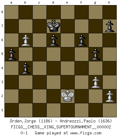 Last move : 0-1 2018 August 15 22:53:46 [Event "FICGS__CHESS__KING_SUPERTOURNAMENT__000002"] [Site "FICGS"] [Date "2018.05.01"] [Round "1"] [White "Orden,Jorge"] [Black "Andreozzi,Paolo"] [Result "0-1"] [WhiteElo "1186"] [BlackElo "1636"] 1.e4 e5 2.f4 d6 3.f5 Nc6 4.Nf3 Nf6 5.Nc3 Be7 6.Be2 O-O 7.O-O d5 8.Nxd5 Nxd5 9.exd5 Qxd5 10.d3 Bxf5 11.a3 Bc5+ 12.Kh1 Qd7 13.b3 a5 14.Bb2 f6 15.Nd2 Nd4 16.Nf3 Nxe2 17.Qxe2 Rad8 18.Nh4 Bg4 19.Nf3 b5 20.Rad1 b4 21.a4 Rfe8 22.d4 Bxf3 23.Qxf3 e4 24.Qg3 Bd6 25.Qh4 Qc6 26.Rc1 e3 27.Qg4 Re4 28.Qf3 Rde8 29.c4 e2 30.Rfe1 Qd7 31.c5 Re3 32.Qd5+ Qe6 33.Qxe6+ R8xe6 34.cxd6 cxd6 35.Rc8+ Kf7 36.d5 R6e4 37.Bc1 Rxb3 38.Ra8 Rb1 39.Bd2 Rxe1+ 40.Bxe1 Rf4 41.g3 Rf1+ 42.Kg2 Rxe1 43.Kf2 Rd1 44.Kxe2 Rxd5 45.Rb8 g5 46.Rb5 Rxb5 47.axb5 Ke7 48.b6 Kd7 0-1 King's gambit Kingside Castling by player Black (move 6) Kingside Castling by player White (move 7) Player Black won this chess game. Follow this game move after move (download)The beauty of a move lies not in its' appearance but in the thought behind it. (Siegbert Tarrasch) Ich habe kein Problem mit Frauen, sondern nur mit dem Niveau ihres Schachspiels (Judith Polgar) Creo que una cierta cantidad de temperamento es esperada de los genios del Ajedrez. (Ron Gross) Le profane ne songe pas à la somme de jouissance dont il se prive, qui méconnaît ce jeu aux ressources aussi variées que passionnantes. (Jean-Marie Jeanton-Lamarche) Any activity becomes creative when the doer cares about doing it right or doing it better. (John Updike)