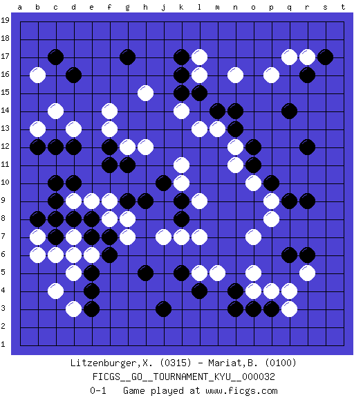 Last move : 0-1 2007 August 2 13:52:42 [Event "FICGS__GO__TOURNAMENT_KYU__000032 "] [Site "FICGS"] [Date "2007.05.04"] [Round "1"] [Black "Litzenburger,Xavier "] [White "Mariat,Benoit "] [Result "0-1"] [Rating 1 "0315"] [Rating 2 "0100"] 1.d16 q4 2.r16 c4 3.e3 d3 4.e4 d5 5.j3 d9 6.o3 o4 7.n4 o5 8.p3 q3 9.r6 r5 10.q6 p4 11.r9 p16 12.q14 r17 13.s17 q17 14.r12 l17 15.g17 c14 16.c17 f14 17.d12 d13 18.c9 c8 19.c10 k10 20.d10 e9 21.f11 g12 22.f12 f13 23.g11 h12 24.g9 g7 25.b8 b7 26.c7 c6 27.d8 d7 28.c8 b6 29.e7 f8 30.f6 e6 31.f7 g8 32.e5 d6 33.e8 f9 34.h9 j7 35.k16 h15 36.k17 l16 37.n14 m13 38.k5 o7 39.k9 l7 40.h5 l9 41.k8 k7 42.n13 n12 43.o12 n11 44.o11 o10 45.m14 l13 46.j10 k11 47.n3 n16 48.p10 p9 49.q9 p8 50.k15 k14 51.l15 l5 52.l4 m5 53.c12 b13 54.b12 b16 0-1 Here are the names of the openings (joseki) played in the four corners : Corner d4 : c4 e3Komoku (Somok, Xiao~mu`) 3-4 Point. The komoku (3-4) point is the traditional corner enclosure move..Ikken Kakari (Hankan Keolch'im, Yi Gua`jiao~, 1-Space Low Pincer). The small knight move is the basic approach move to the 3-4 point stone. It has been continually used for over four centuries. There are limitless variations, with new moves constantly being discovered. Black 2 opens the door to a treaure store of joseki. Corner q4 : q4 o3Hoshi (Hwajeom, Seongjeom, Xingwei`) 4-4 Point. The star or hoshi (4-4) point, emphasizing influence at the potential expense of territory.Ikken Kakari (Hankan Keolch'im, Yi Gua`jiao~, 1-Space Low Approach). Black 2 is the standard approach move to the 4-4. Corner q16 : r16 p16Komoku (Somok, Xiao~mu`) 3-4 Point. The komoku (3-4) point is the traditional corner enclosure move..Ikken Takagakari (Hankan Nop'dakeolch'im, Yi Gaogua`jiao~, 1-Space High Approach). The 5-4 approach move has become more popular in modern times, as modern Go emphasizes speed and influence. Player White won this Go (weiqi, baduk) game.Follow this game move after move (download ) Strange things happen at the one-two points. (Anonymous) To err is human, to shift the blame on someone else is tactical. (Mladen Jankovic)