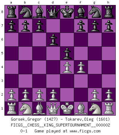 Last move : 0-1 2018 June 7 1:20:58 [Event "FICGS__CHESS__KING_SUPERTOURNAMENT__000002"] [Site "FICGS"] [Date "2018.05.01"] [Round "1"] [White "Gorsek,Gregor"] [Black "Tokarev,Oleg"] [Result "0-1"] [WhiteElo "1427"] [BlackElo "1601"] 1.e4 e5 2.f4 d6 0-1 This chess game has been lost on time (started : 2018.05.01 22:10:15) King's gambit Player Black won this chess game. Follow this game move after move (download)The stomach is an essential part of the Chess master. (Bent Larsen) Über Karpov: Er war und ist ein Vertreter der russischen Reaktionäre. Das steckt tief in seiner Seele, wehalb ich nicht nett mit ihm umgehen kann. (Viktor Kortschnoi) El Ajedrez es tan interesante por sí solo, que no es necesario un interés monetario para persuadir a una persona a que lo practique; por lo tanto, nunca se juega por dinero. (Benjamin Franklin) Horreur, mais aussi harmonie suprême : qu'y avait-il en effet au monde en dehors des échecs ? Le brouillard, l'inconnu, le non-être... (Vladimir Nabokov) Industry executives and analysts often mistakenly talk about strategy as if it were some kind of chess match. But in chess, you have just two opponents, each with identical resources, and with luck playing a minimal role. The real world is much more like a poker game, with multiple players trying to make the best of whatever hand fortune has dealt them. In our industry, Bill Gates owns the table until someone proves otherwise. (David Moschella, 'Computerworld')